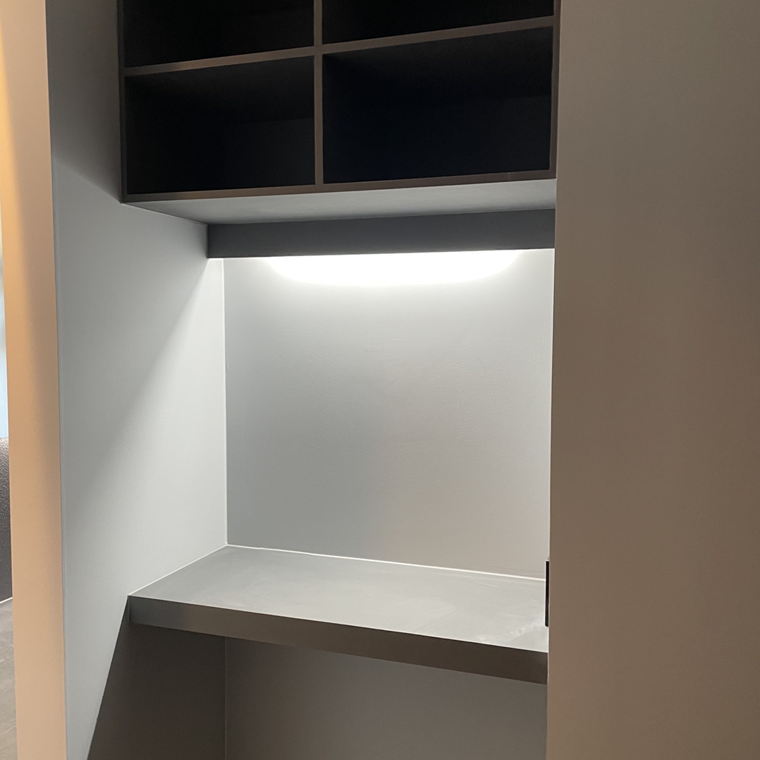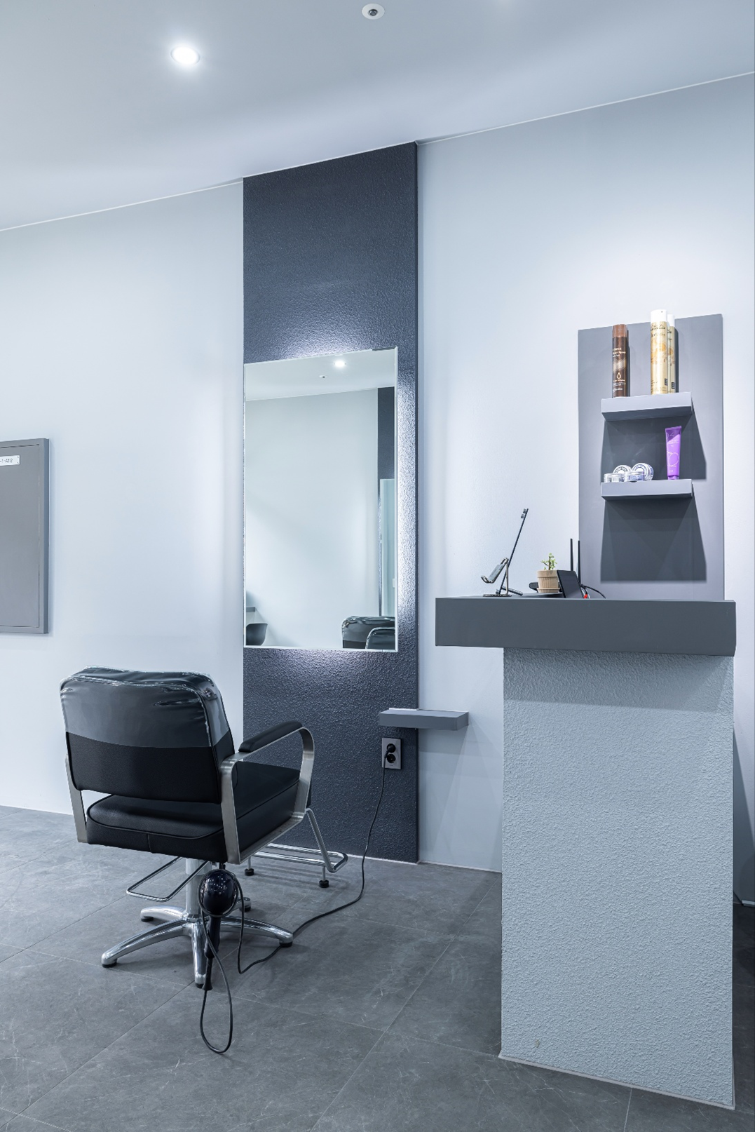 이번 소형 미용실 1인 헤어샵의 리셉션 공간은 그레이와 화이트의 조화로 모던하면서도 현대적인 인상을 심어주었습니다.