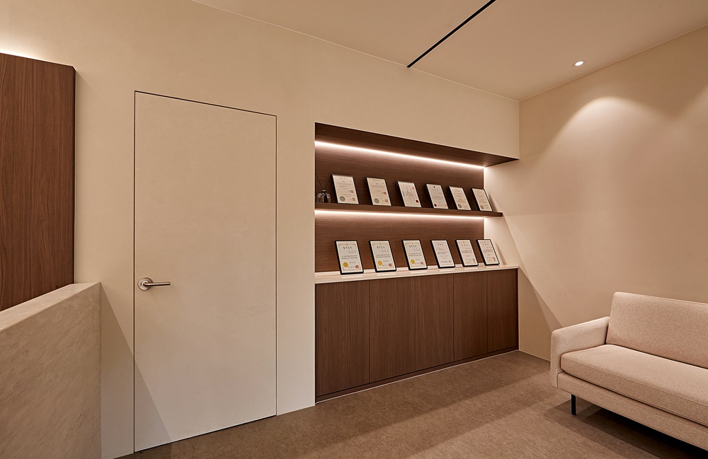 대기실은 고객이 편안하게 대기할 수 있도록 소파와 테이블을 배치하였고, 한쪽에는 커피머신과 냉장고를 두어 간단한 음료를 제공할 수 있도록 하였습니다.