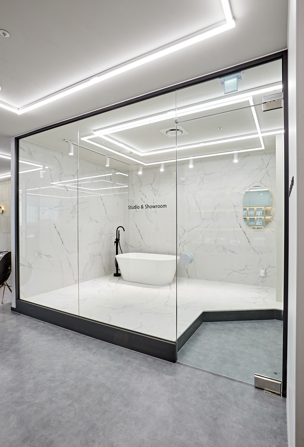 욕실 브랜드 쇼룸의 레이아웃은 고객의 동선과 시선을 고려하여 설계했는데요.
