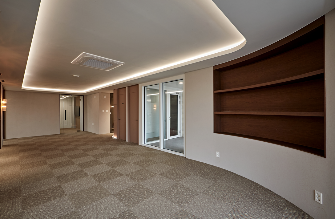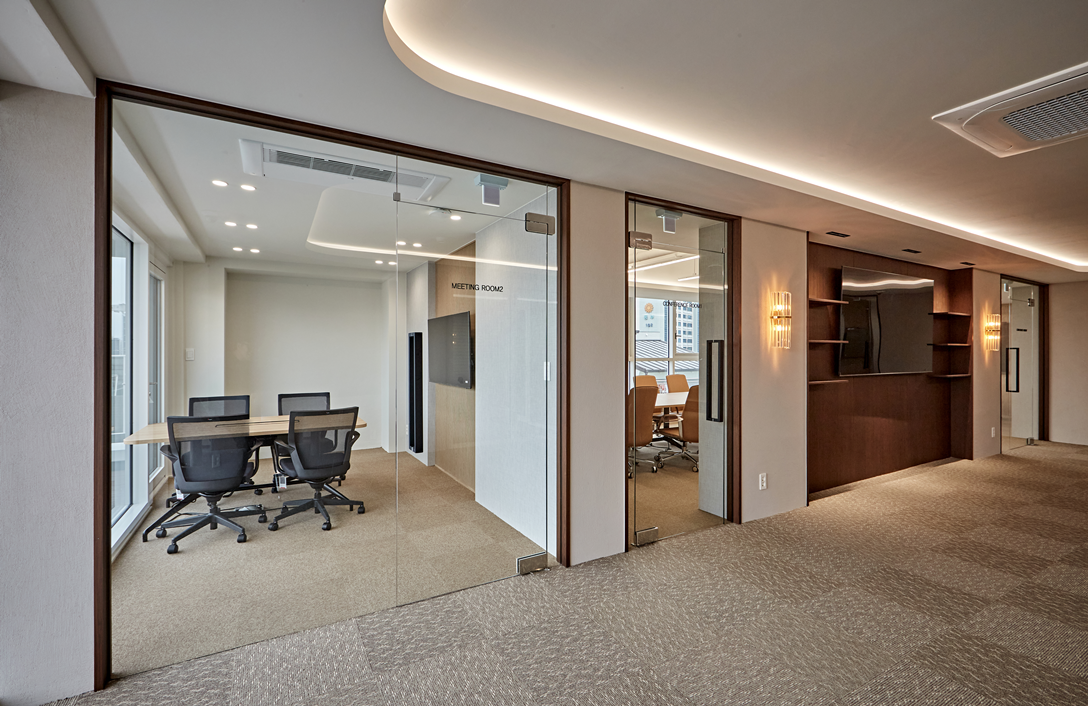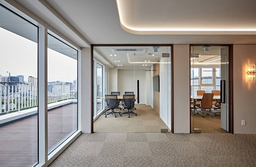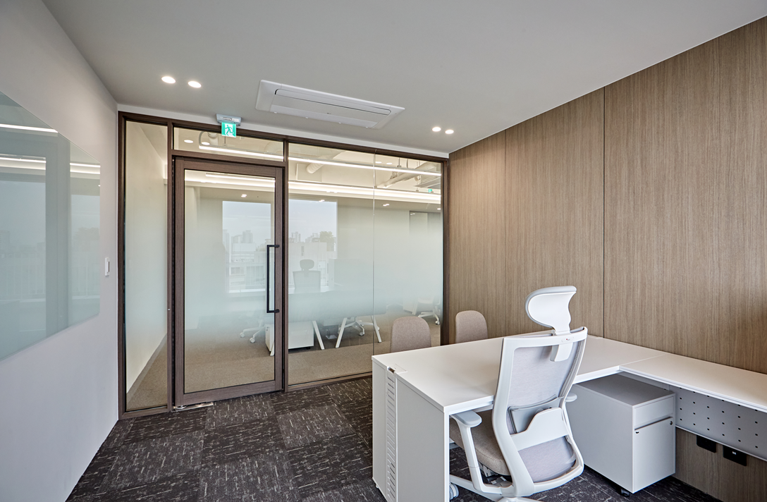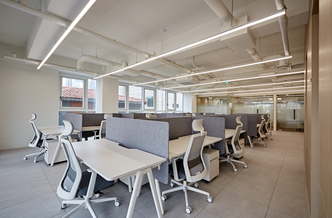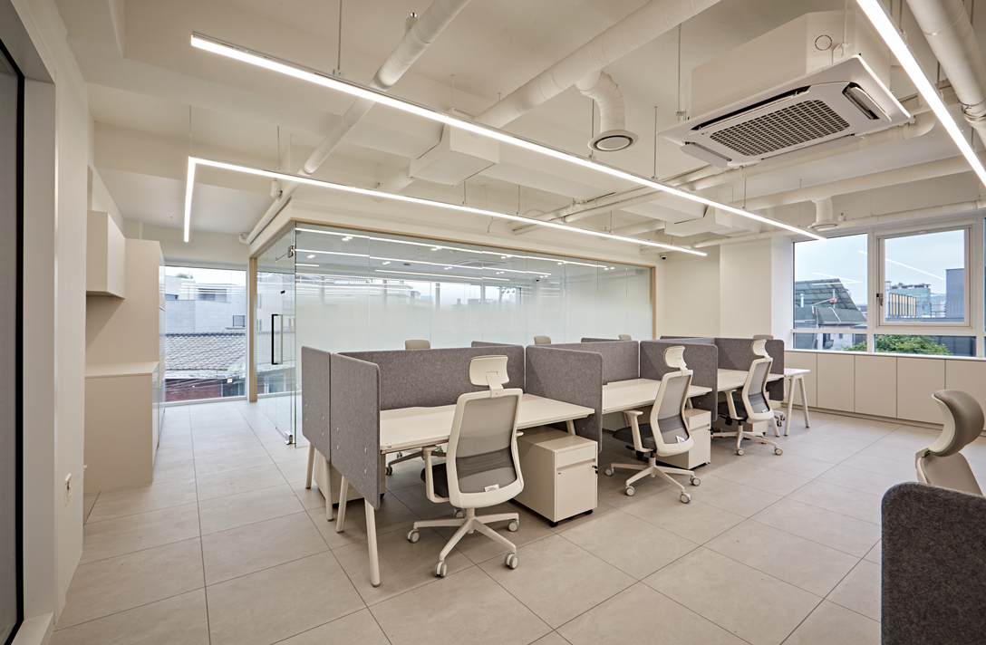 조명은 주 백색 간접조명과 라인등을 적절하게 배치해 눈부심을 줄이면서도 충분한 밝기를 확보했으며, 사무공간외의 공간은 유리가벽을 활용하여 개방감 있게 연출하였습니다.