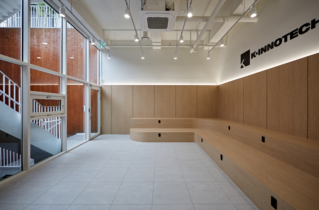 휴게공간은 직원들이 자유롭게 쉴 수 있는 공간으로, 우드 색상으로 연출하고 자연광이 가득 들어오는 창가 공간에는 바 테이블과 스툴을 배치해 아늑한 분위기를 연출하였습니다. 간단한 커피와 음료를 즐길 수 있는 미니 키친 공간도 마련하여 복지 기능을 강화했습니다.