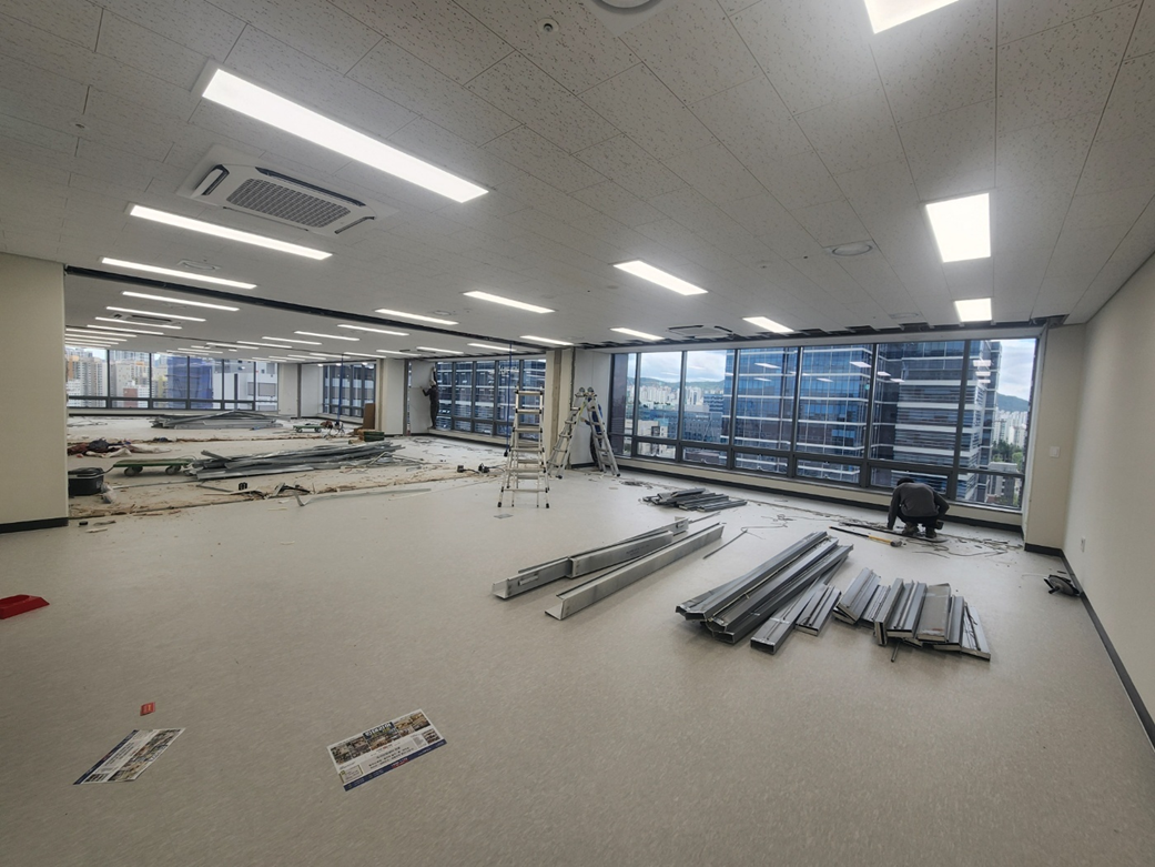 개방형 사무공간의 포인트인 유리가벽 설치 과정입니다.