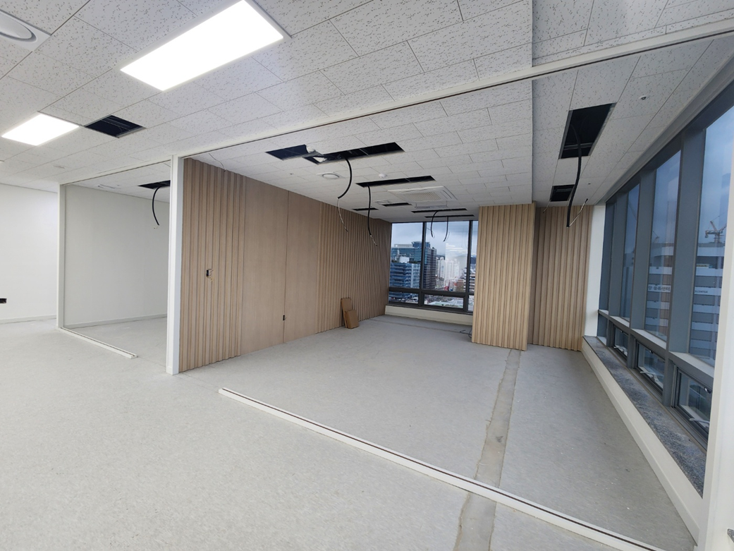 사무공간 한쪽 벽면에는 원목 패널을 고정할 수 있도록 목재 프레임을 설치 후,