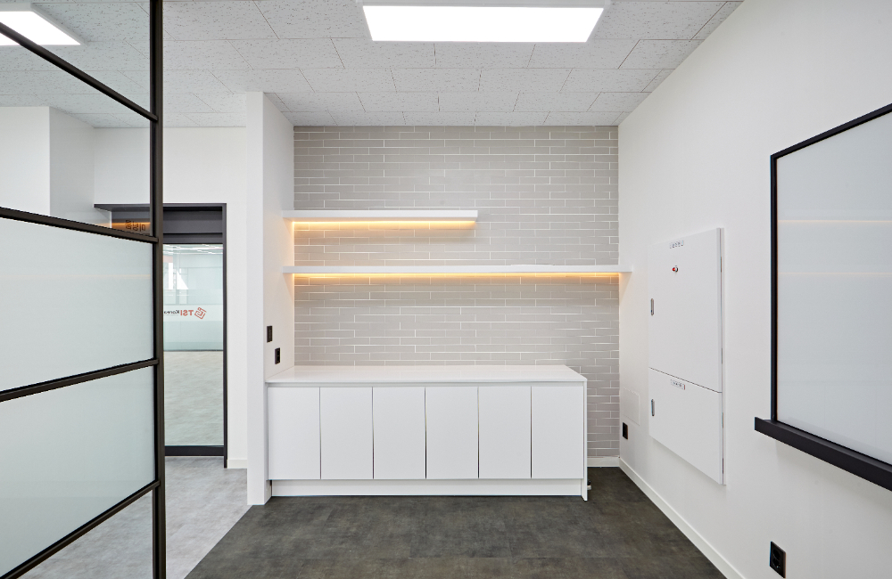 - 또한 팀별 사무실도 마찬가지로 바닥은 어둡게 처리하였고, 근무를 하는 곳인만큼 LED 사각 조명을 설치하여서 훤히 밝힐 수 있도록 하였습니다.