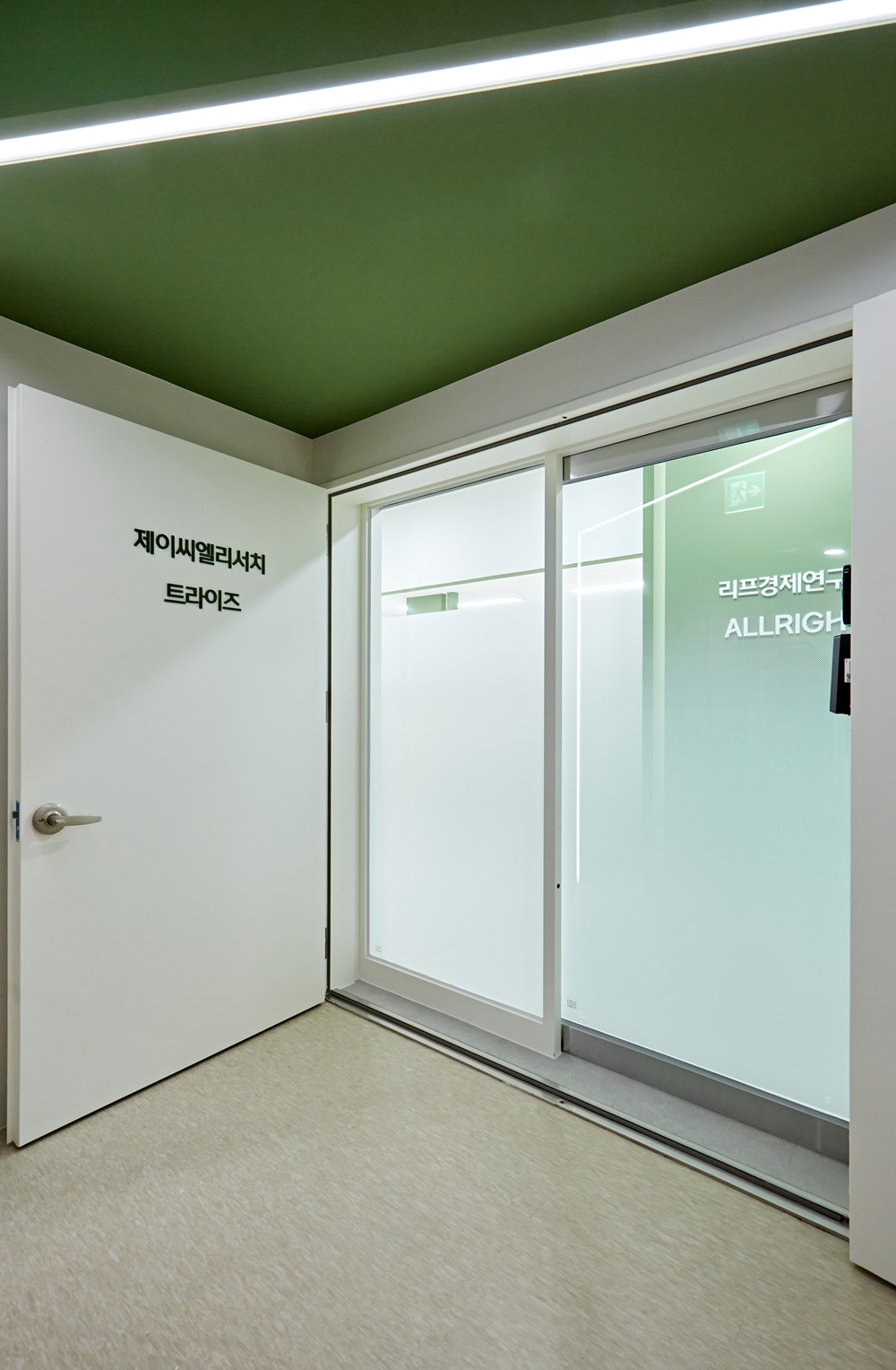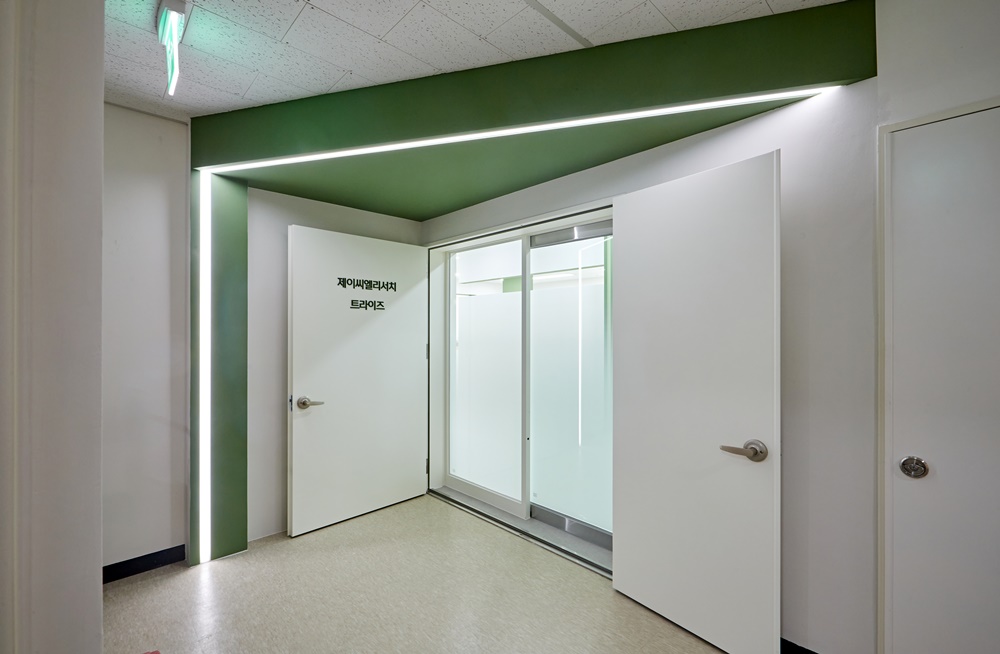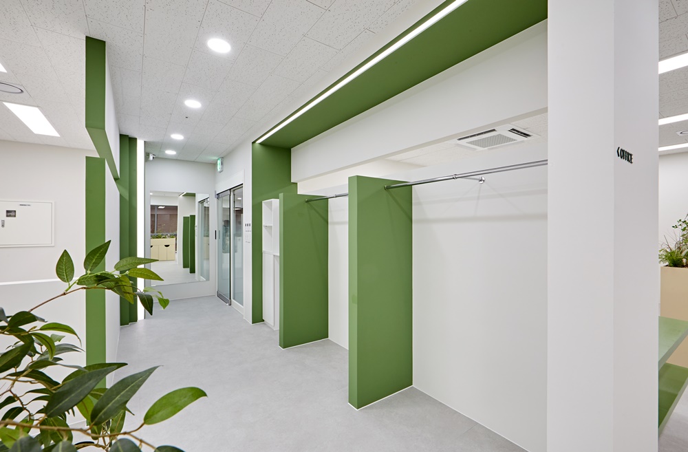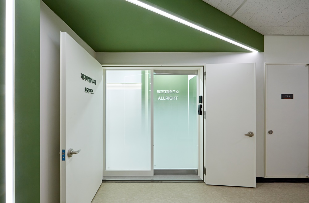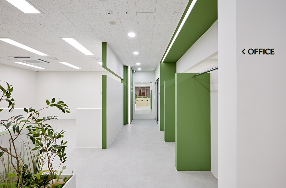 먼저 사무실의 첫인상을 결정짓는 입구 파사드부터 살펴보면, 화이트 도어와 세이지 그린 컬러의 대비가 아주 세련되게 연출되었는데요.