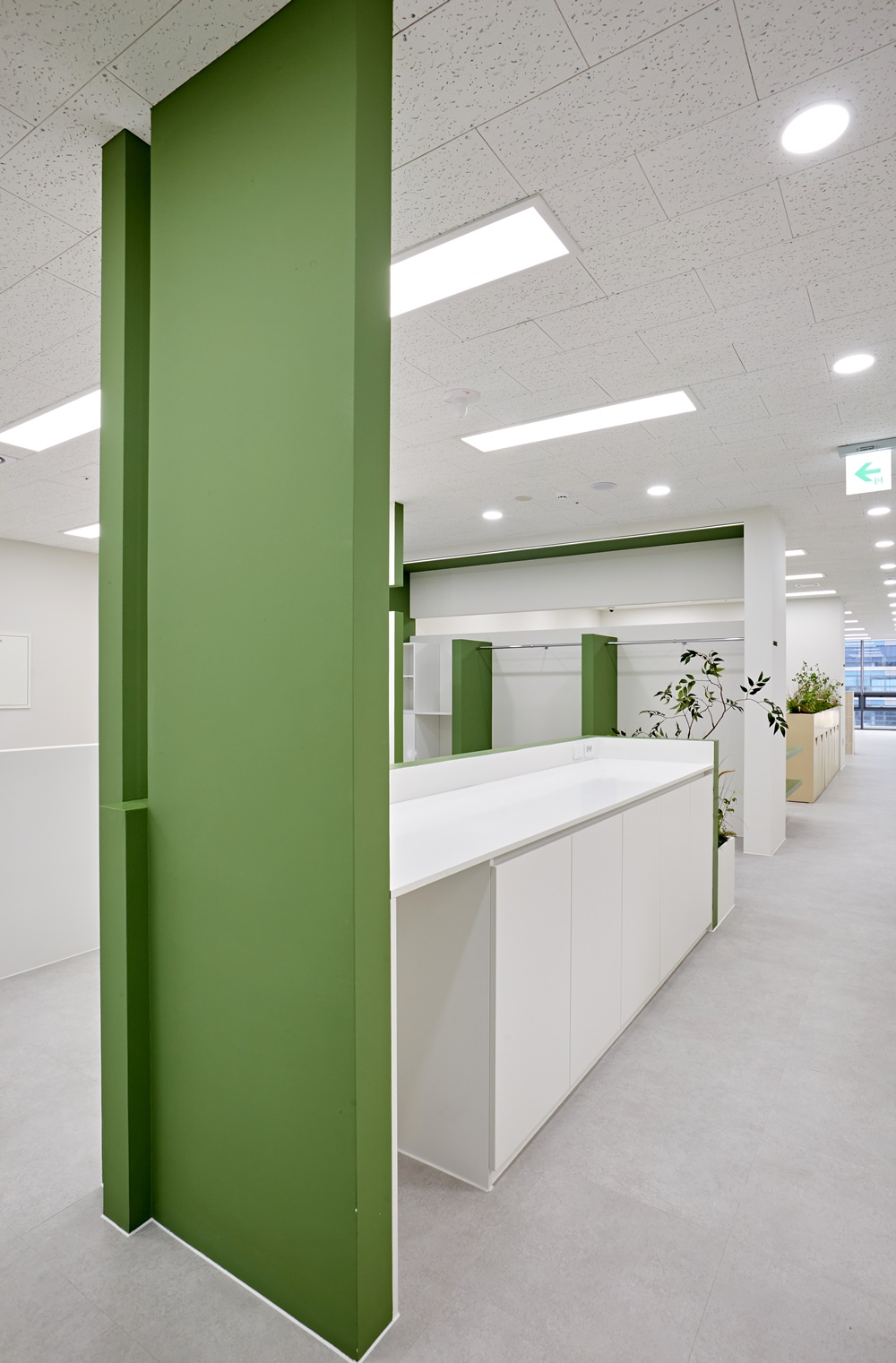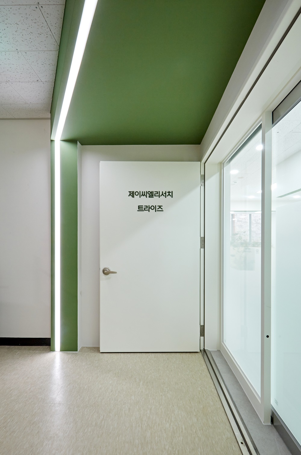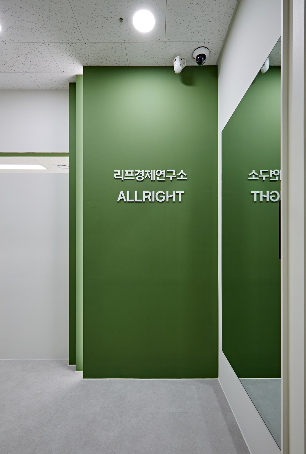먼저 사무실의 첫인상을 결정짓는 입구 파사드부터 살펴보면, 화이트 도어와 세이지 그린 컬러의 대비가 아주 세련되게 연출되었는데요.