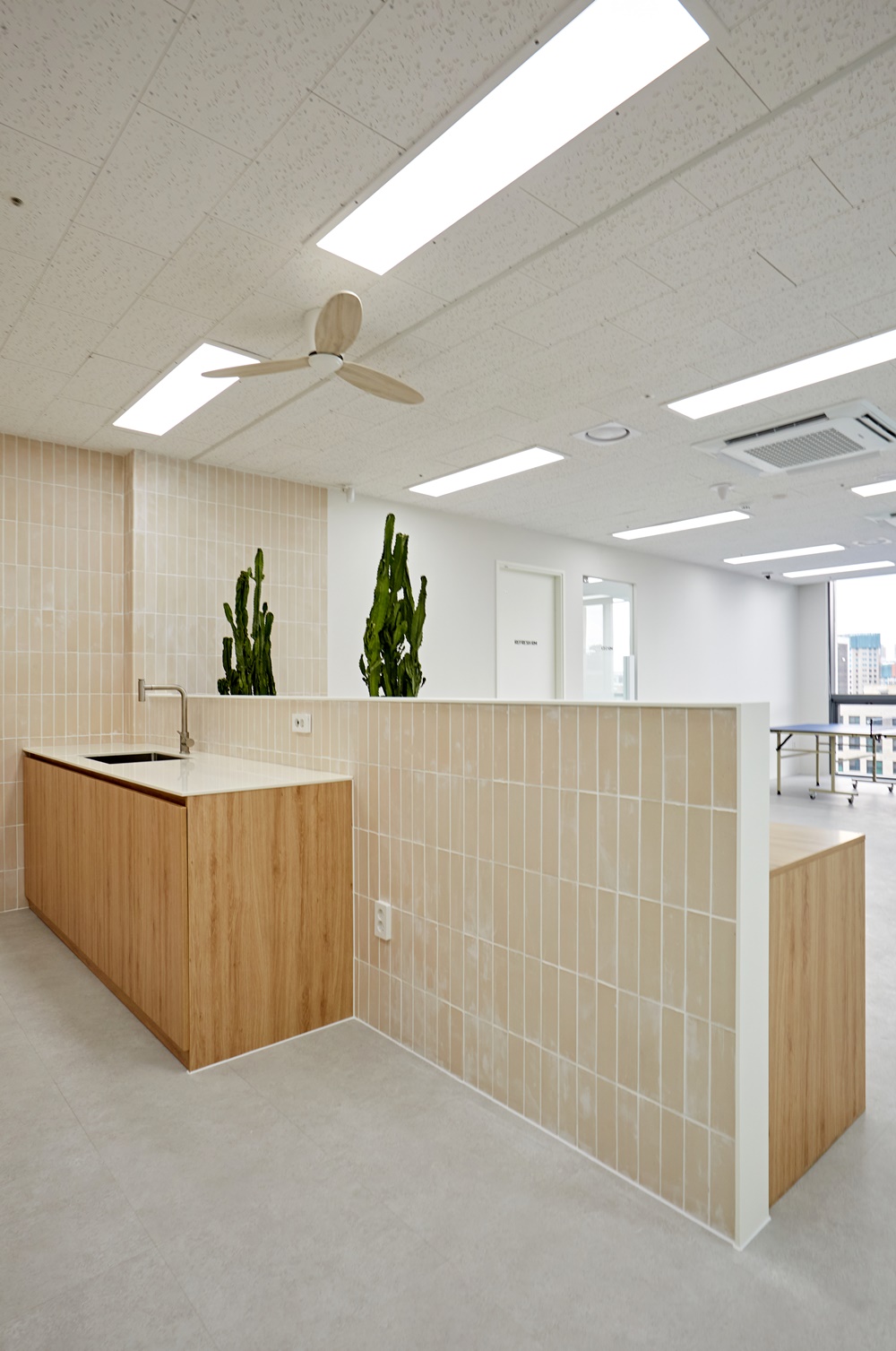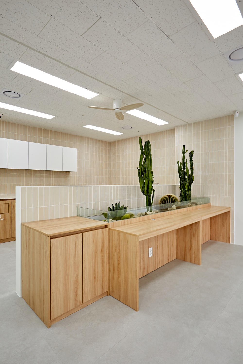 특히 카페테리아 한쪽 가벽에는 유리 가드를 설치한 전용 플랜트 공간을 마련하여 대형 선인장과 다육식물들을 배치했는데요.