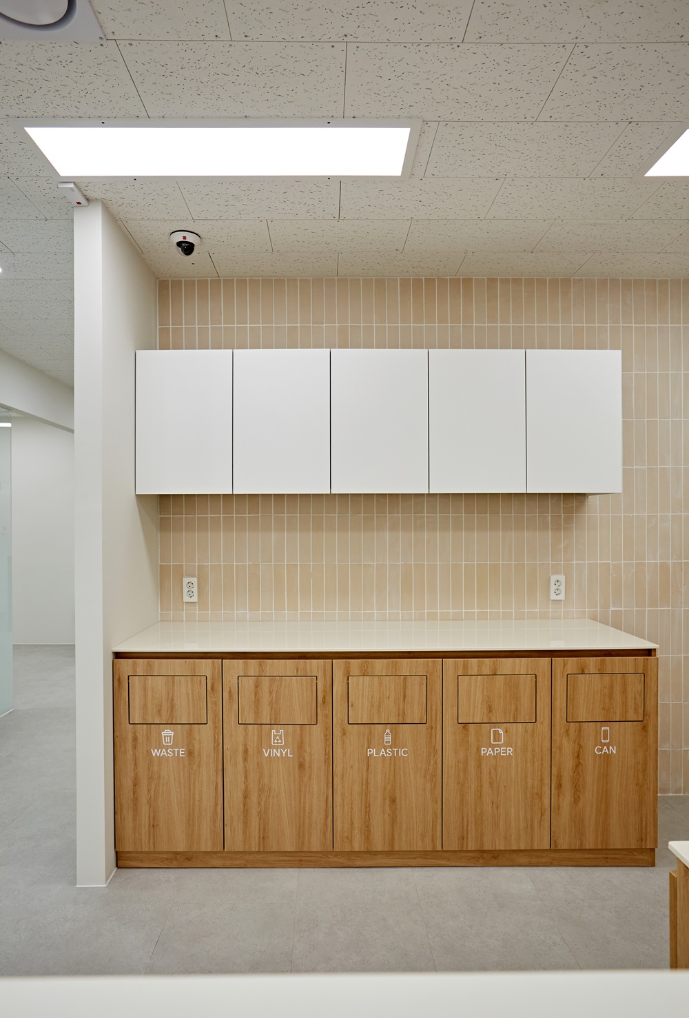 Waste, Vinyl, Plastic, Paper, Can 등 항목별로 깔끔하게 매립된 수납장은 지저분해 보일 수 있는 쓰레기통을 완벽히 가려주어 오피스의 청결도를 높여준답니다.