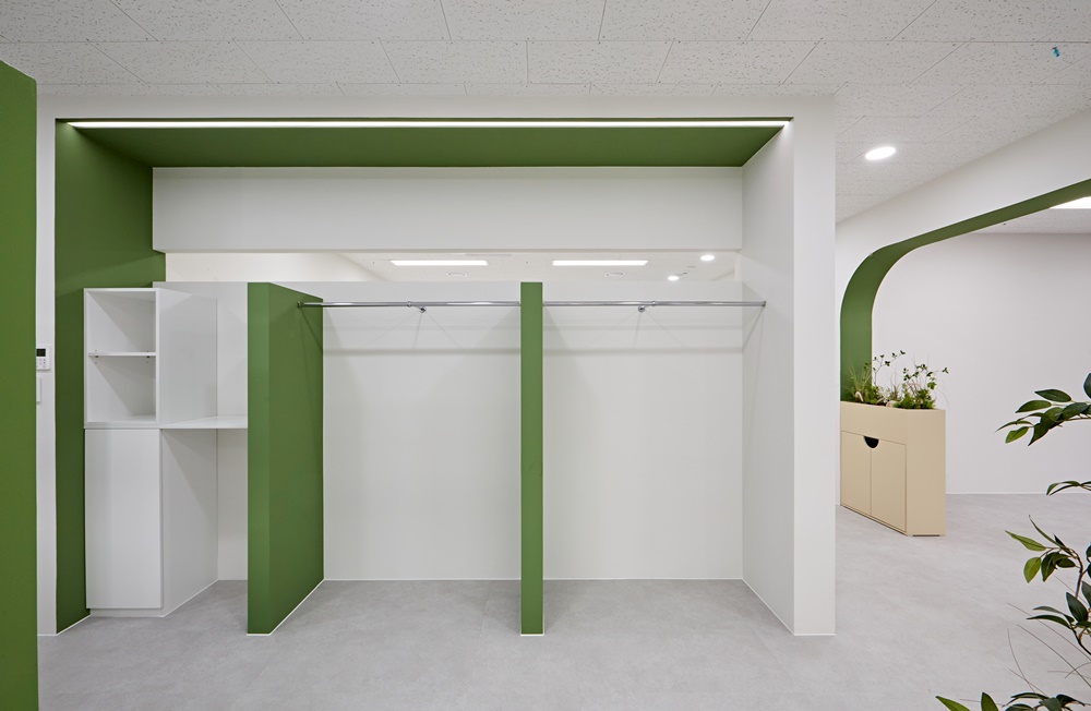 뒤편에는 직원들의 개인 물품이나 외투를 깔끔하게 보관할 수 있는 행거 시스템과 오픈형 수납 공간이 마련되어 있는데요.