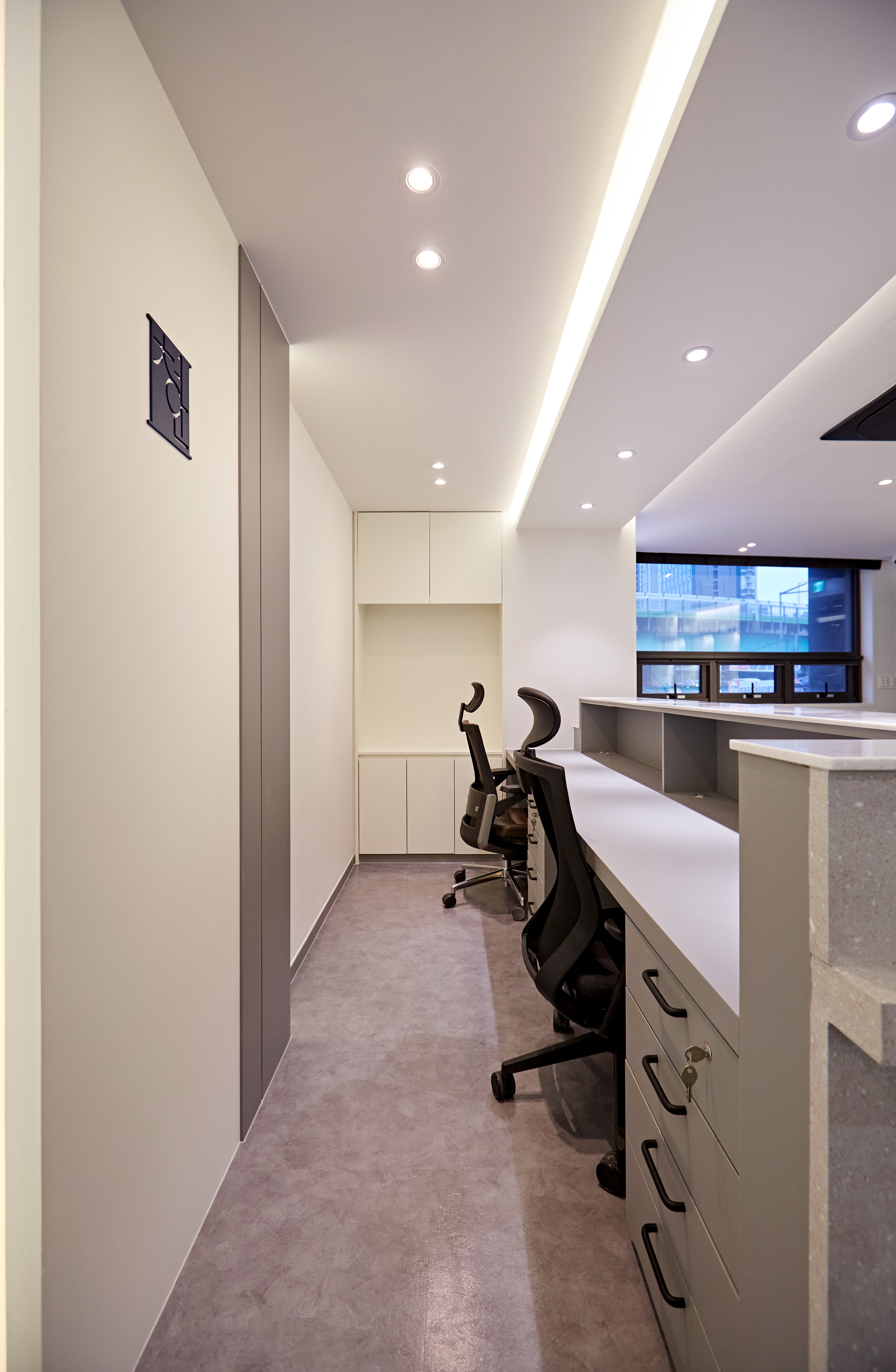 복도 끝 벽면에는 로고 사인을 한 번 더 강조해 공간의 중심을 잡아주었고, 천장에 매립된 시스템 에어컨은 화이트 톤의 인테리어와 이질감 없이 녹아들도록 위치를 선정했습니다.