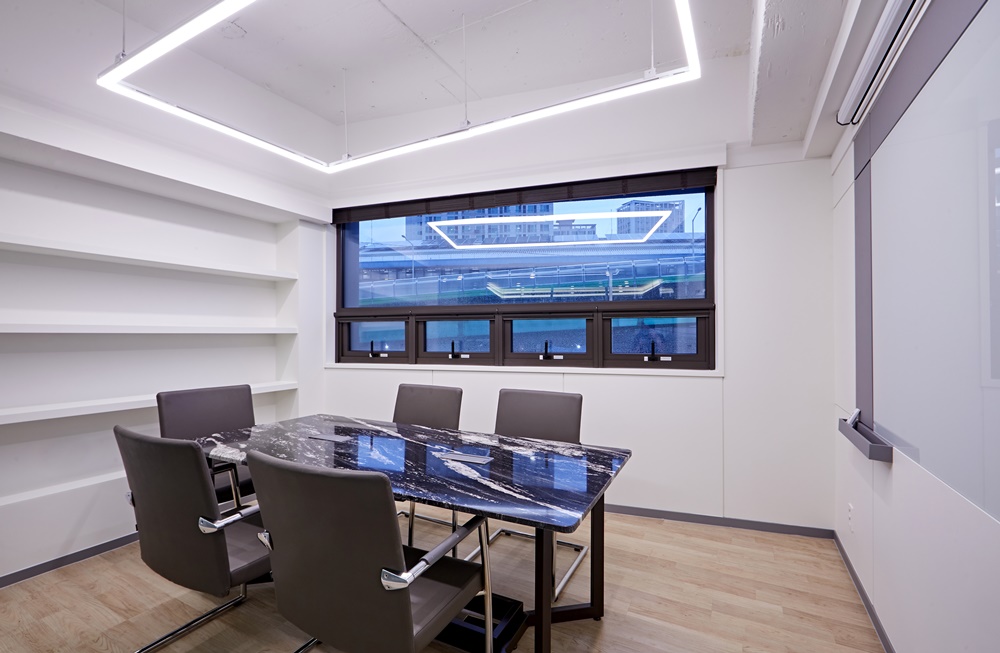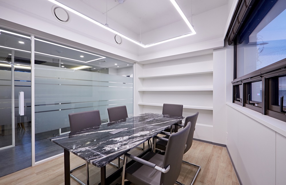 넓은 창을 통해 채광이 가득 들어오는 회의실에는 블랙과 화이트 패턴이 섞인 고급스러운 대리석 테이블을 배치했습니다.