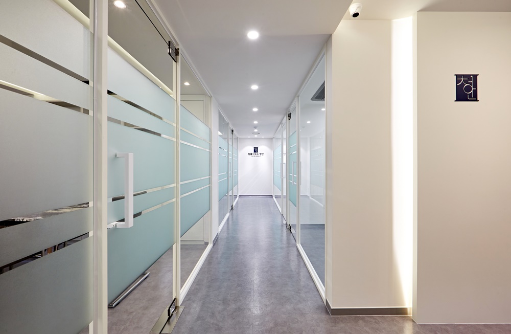 긴 복도를 따라 배치된 개별 집무실과 상담실은 투명한 유리 가벽을 선택해 좁은 복도임에도 불구하고 답답함이 전혀 느껴지지 않는데요.