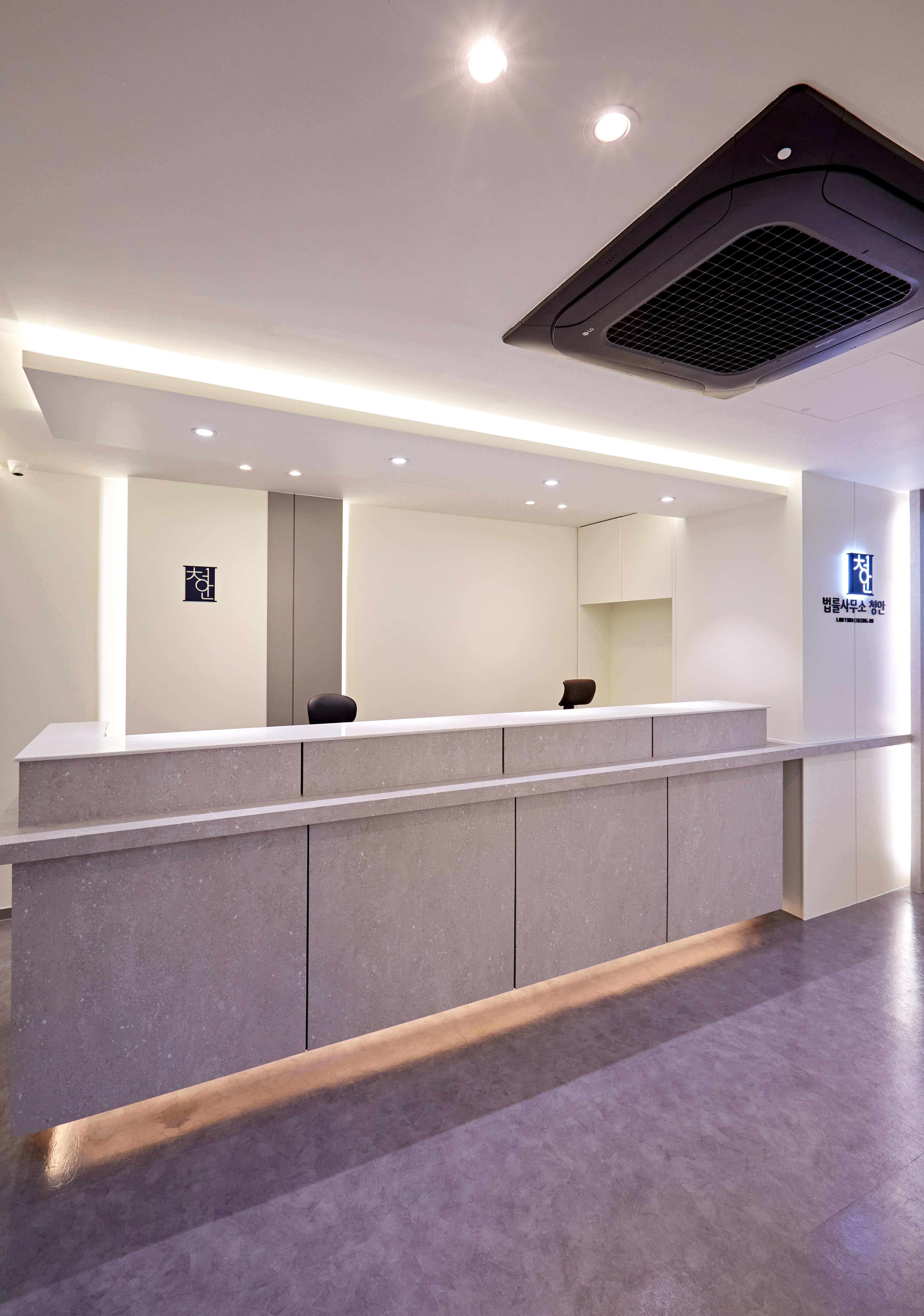 데스크 뒷벽에는 입구와 통일감을 주는 로고 사인을 배치해 브랜딩을 강화했고, 천장의 매립형 라인 조명은 안내 데스크의 선을 따라 길게 뻗어 공간의 깊이감을 극대화해 준답니다.
