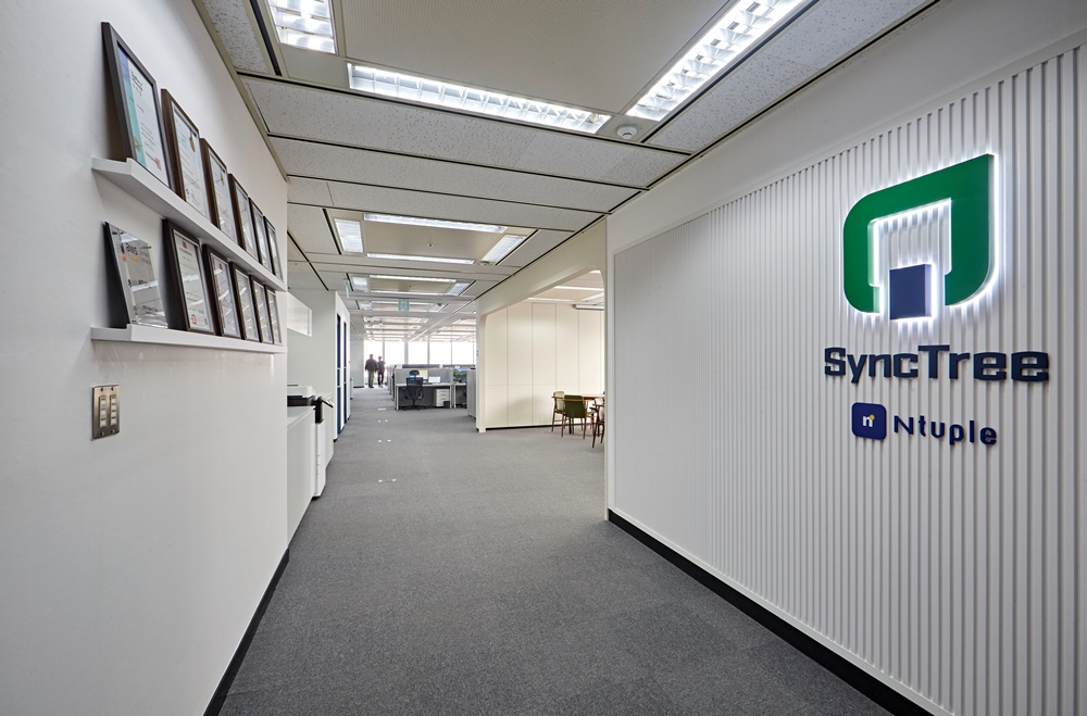 입구 쪽에는 기업의 정체성을 보여주던 'SyncTree'와 'Ntuple' 로고 현판이 부착된 아트월이 자리 잡고 있습니다.