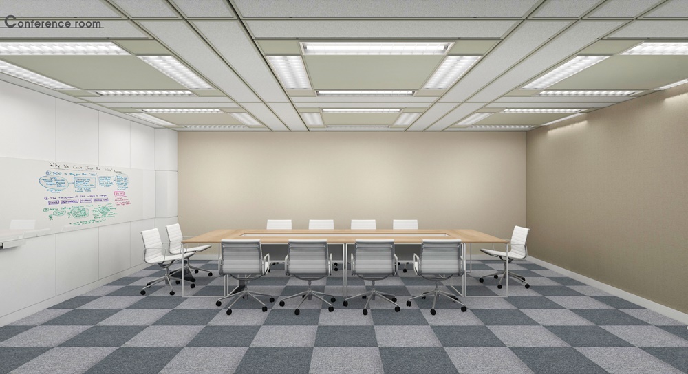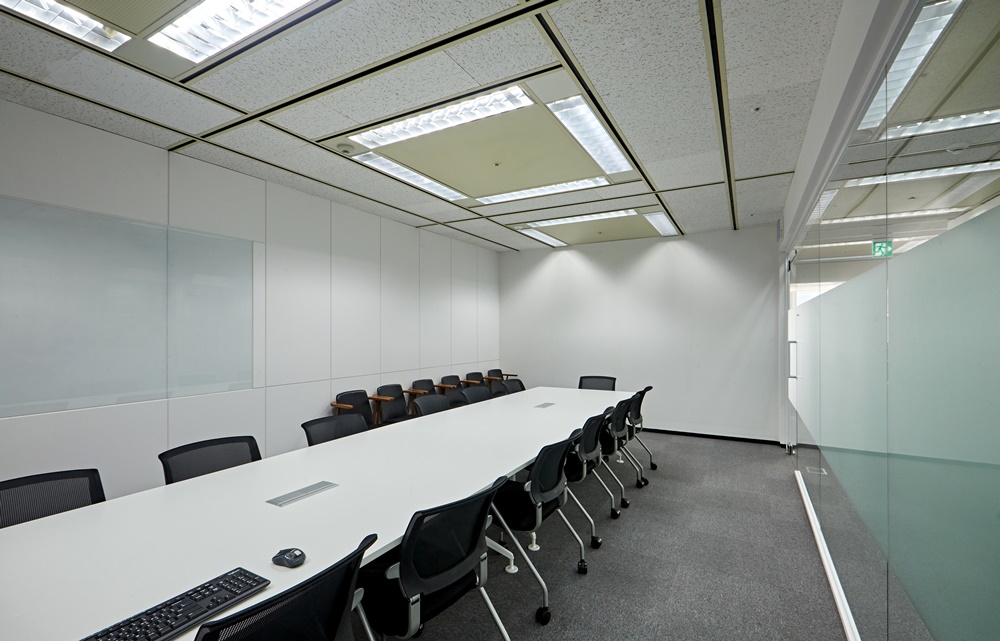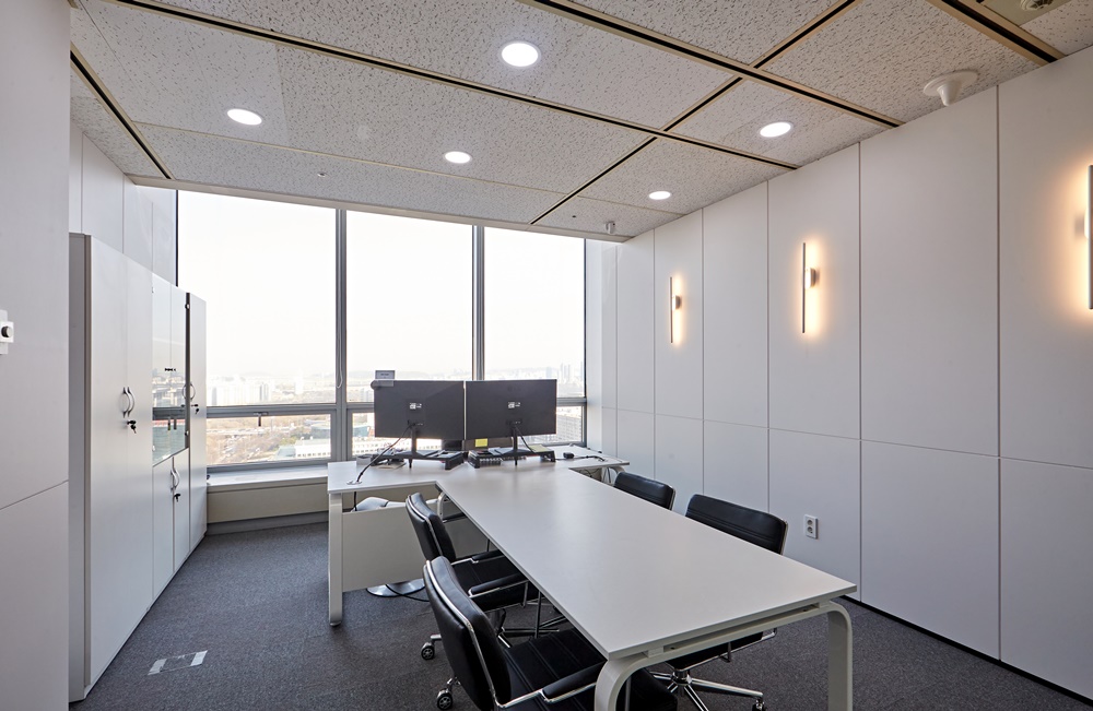 회의실 내부에 배치된 화이트 테이블과 블랙 체어의 조화는 모던함의 정석을 보여주며, 천장의 매립등은 눈의 피로도를 낮추는 조도로 세팅하여 업무 효율을 높였습니다.