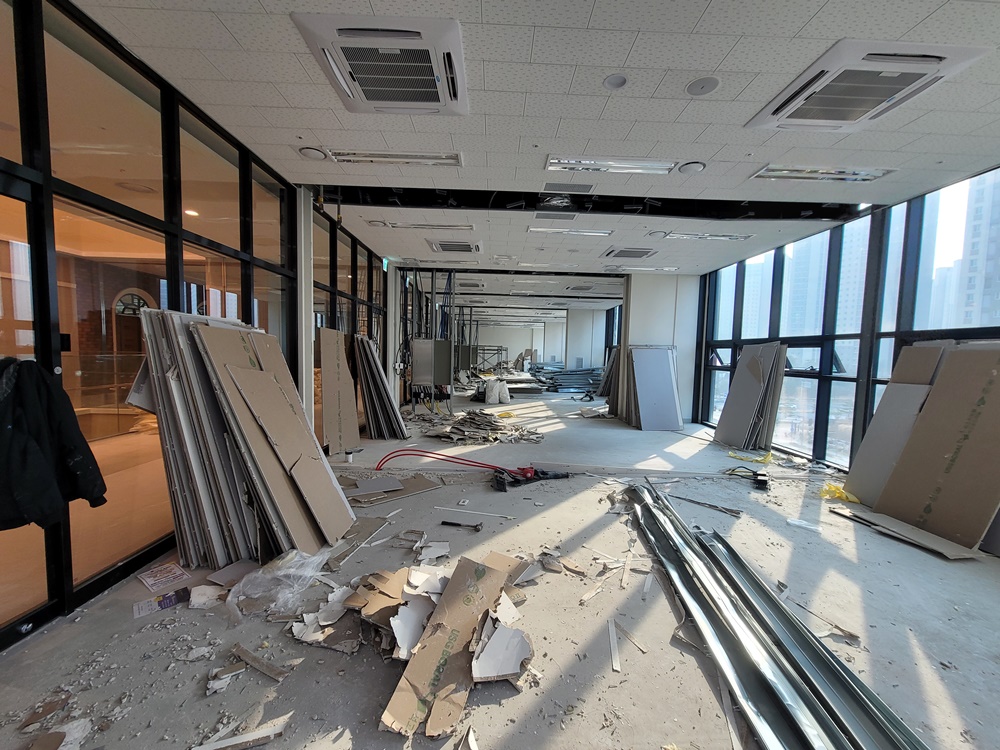 계획이 수립되면 복구공사의 첫 단계인 철거 공사를 통해 사무실 내 모든 시설물을 제거합니다.