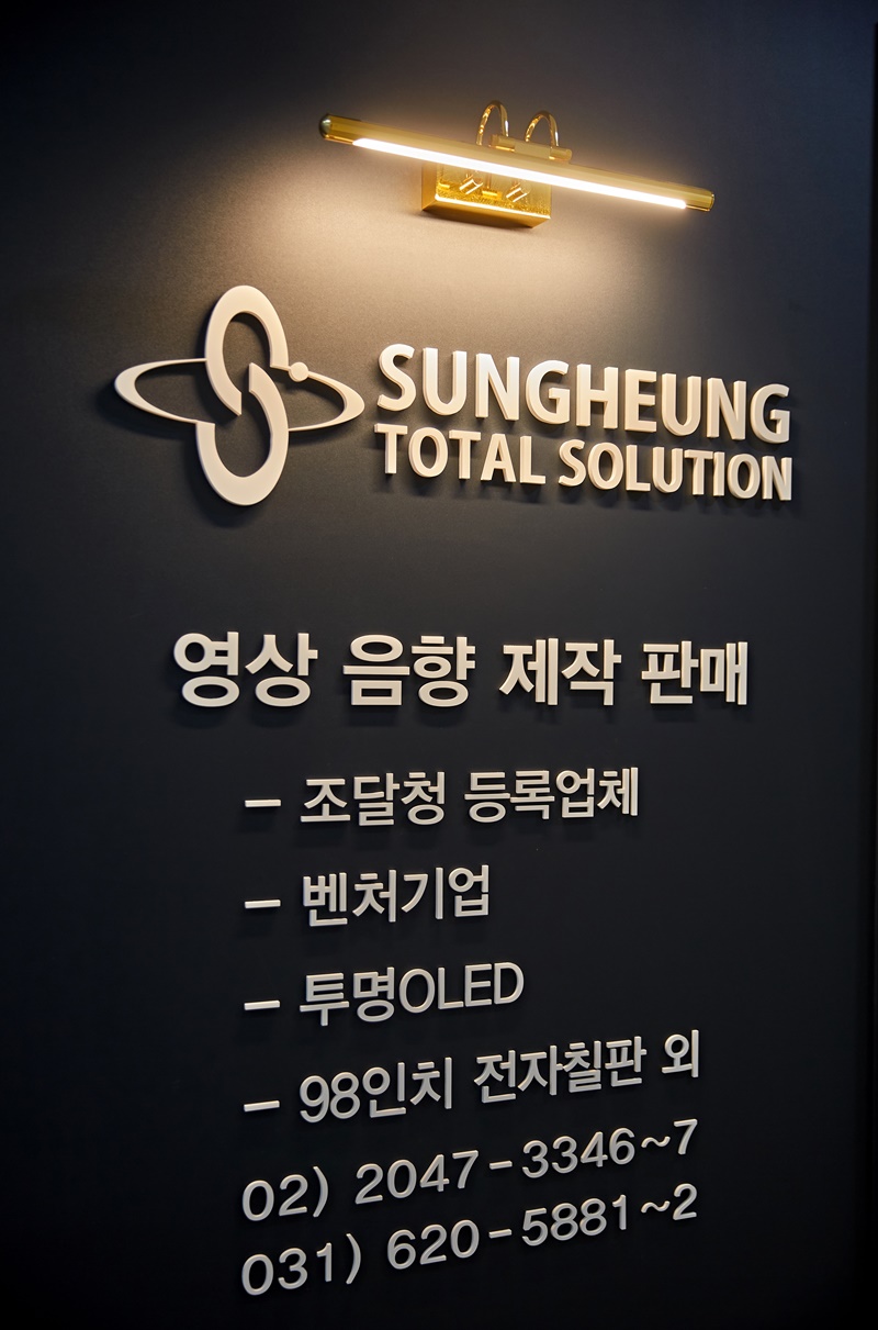 벽면에 입체적으로 제작된 'SUNGHEUNG TOTAL SOLUTION' 로고는 조명을 받아 은은한 그림자를 형성하며 브랜드의 존재감을 각인시킨답니다.