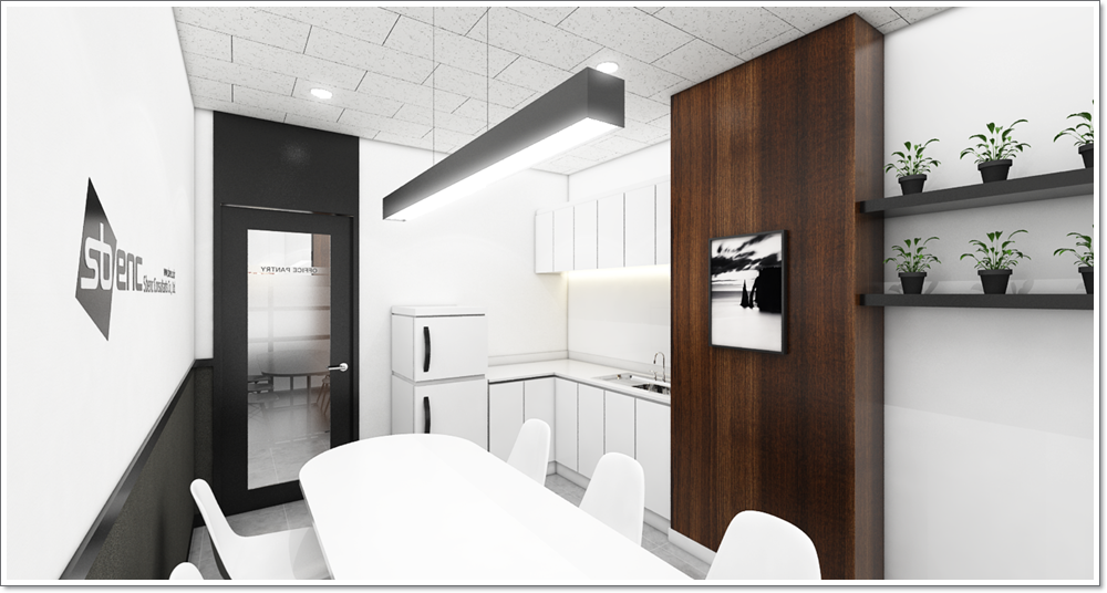 탕비실의 전경입니다. 사무공간과의 분리성을 위해서 출입문은 검정색의 불투명한 유리를 이용해서 인테리어 하였으며 내부에 테이블과 의자, 싱크대, 냉장고를 화이트톤을 이용해서 가구 인테리어 해보았습니다. 뿐만 아니라 화이트톤만 있으면 탕비실 자체가 공허해보일 수가 있으니 외벽에는 블랙톤을 이용하여 독창성을 주었고 다른 한쪽에는 우드 기둥을 세워서 수납장을 설치함으로 공간의 활용성을 사용해보았습니다.