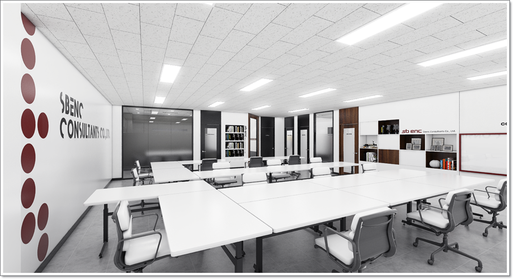 사무공간의 전경입니다. 화이트톤으로 되어있는 벽과 동시에 바닥은 그래이 톤을 이용하여 구성하였고 천장도 그레이톤의 타일을 사용해서 인테리어 해보았습니다. 또한 정면으로 보이는 큰 외벽에는 세련된 문구를 넣어서 한층 더 기업의 모던함을 강조해보았습니다. 출입문을 들어오자마다 넓게 형성되어 있는 사무공간과 동시에 우측에 있는 임원실과 회의실과의 공간적인 분리를 부분의 특성에 따라 나눔으로 한층 더 멋진 사무공간을 볼 수가 있습니다.
