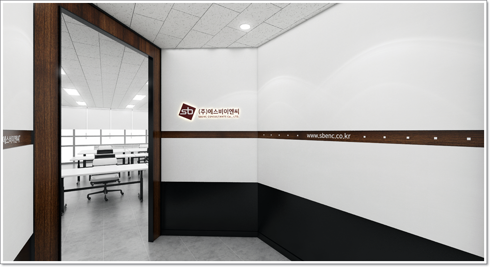 문을 열고 들어가면 이와 같은 전경이 보입니다 ISO 도안을 통해 설명드렸듯이 화이트톤을 이용해서 전체적인 외벽을 인테리어 하였으며 가운데에는 갈색 띠를 추가하여 화이트톤의 모던함에 느낌을 조금 추가하였습니다. 출입문을 열자마자 기업의 로고가 보이게 하는 것은 덤입니다. 또한 사무공간과의 공간적 분리성을 나누어서 조금더 세련된 입구가 만들어지게 하였습니다.