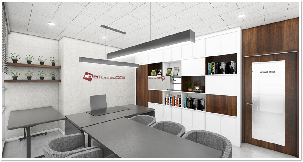 마지막으로는 대표실의 전경을 보여드리겠습니다. 임원실과 비슷해보일 수 있지만 대표실은 뒷 외벽 부분을 베이지 톤에 기업의 로고를 달음 으로서 대표로서의 이미지를 부각시킬 수 있게 디자인을 해보았습니다.