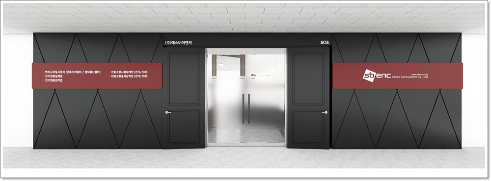 출입문의 전경입니다. 화이트톤으로 되어있는 내부와는 달리 블랙톤을 이용해서 디자인을 하였으며 외벽에는 일정한 무의를 넣고 붉은색의 인테리어를 추가함으로써 밋밋한 느낌을 제거하였고 출입문같은 경우는 외부 문에는 몰딩을 하여 고급스러움을 추가하였을 뿐만 아니라 내부의 문은 유리문에 불투명한 소재를 사용하여 외부와 내부의 분리를 해보았습니다.