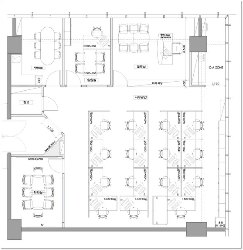 도안을 보고 설명해드리겠습니다. 탕비실, 입원실, 대표실, 사무공간, 창고, 회의실, OA 공간 으로 나뉘어져 있으며 각 공간마다의 효율적인 공간배치를 통해서 최적의 20평 30평 디자인을 해보았습니다.