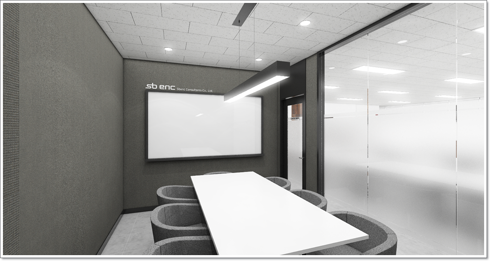 회의실의 전경입니다. 다른 공간과는 달리 천장과 바닥 말고도 외벽까지 그레이톤을 사용함으로서 회의실의 진중한 분위기를 한층더 강조해보았습니다. 그레이톤으로 되어있는 공간은 상대적으로 어두워보일 수가 있습니다. 저희 916 디자인은 테이블 위에 큰 조명을 설치함으로써 시선의 집중이 되는 진중한 회의실을 분위기에 한층더 강조를 하였습니다.