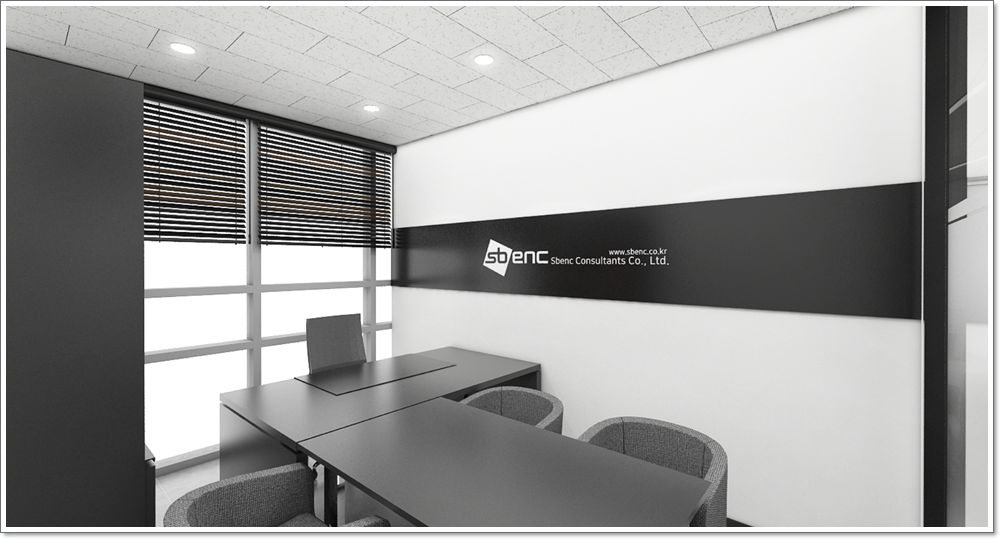 임원실의 전경입니다. 기업의 임원들이 언제든지 와서 회의를 할 수 있도록 책상 2개와 의자 5개를 배치하였고 뒤쪽에는 바깥의 외경이 보일수 있도록 할 뿐만 아니라 임원실을 조금 더 공간적으로 크게 보일 수 있게 하였습니다. 외벽 같은 경우에는 공간적인 부분을 늘리고자 화이트톤을 이용한 외벽을 그대로 사용하였고 가운데에는 블랙톤의 인테리어를 추가하고 기업의 로고를 붙임으로 한층더 임원실의 분위기를 살렸습니다.