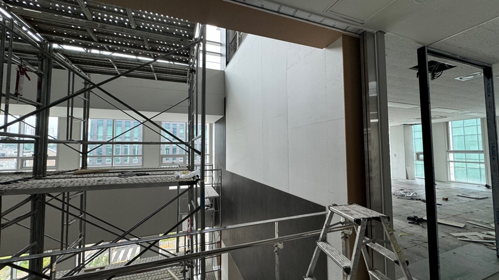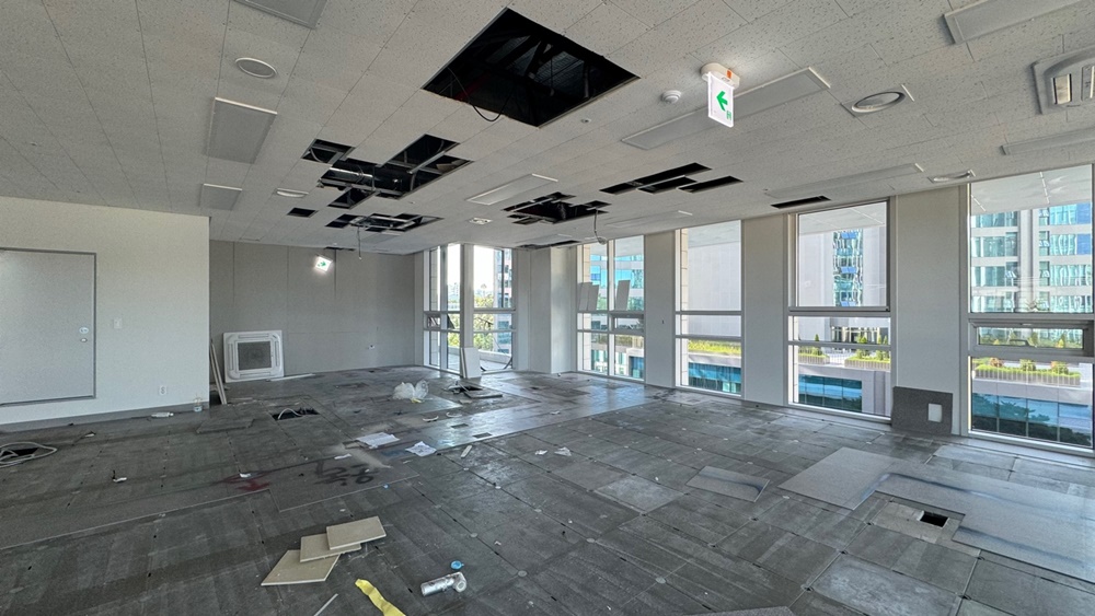 상가사무실인테리어에서 가장 까다로운 부분 중 하나인 유리 가벽 설치를 위해 바닥과 천장의 수평을 완벽하게 맞추는 평탄화 작업을 우선적으로 진행하였습니다.