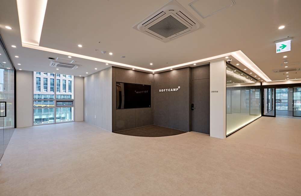 사무실의 첫인상을 결정짓는 입구 공간이기 때문에 다크 그레이 톤의 아트월과 깔끔한 화이트 로고를 매치하여 기업의 전문성과 신뢰감을 강조했습니다.