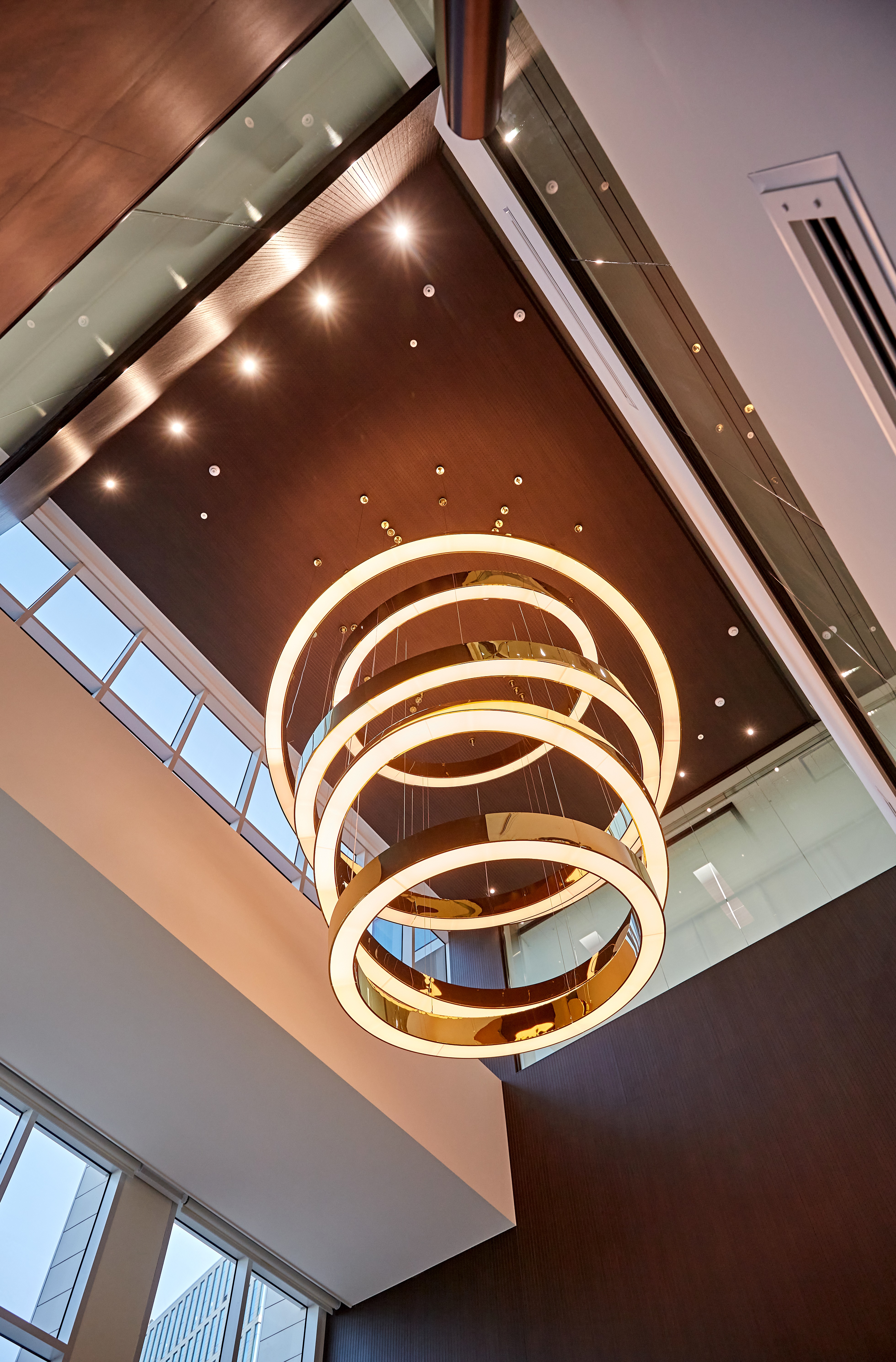 복층 구조의 높은 층고를 활용하여 대형 링 샹들리에를 설치했는데 이는 공간의 중심을 잡아주는 오브제 역할을 톡톡히 합니다.
