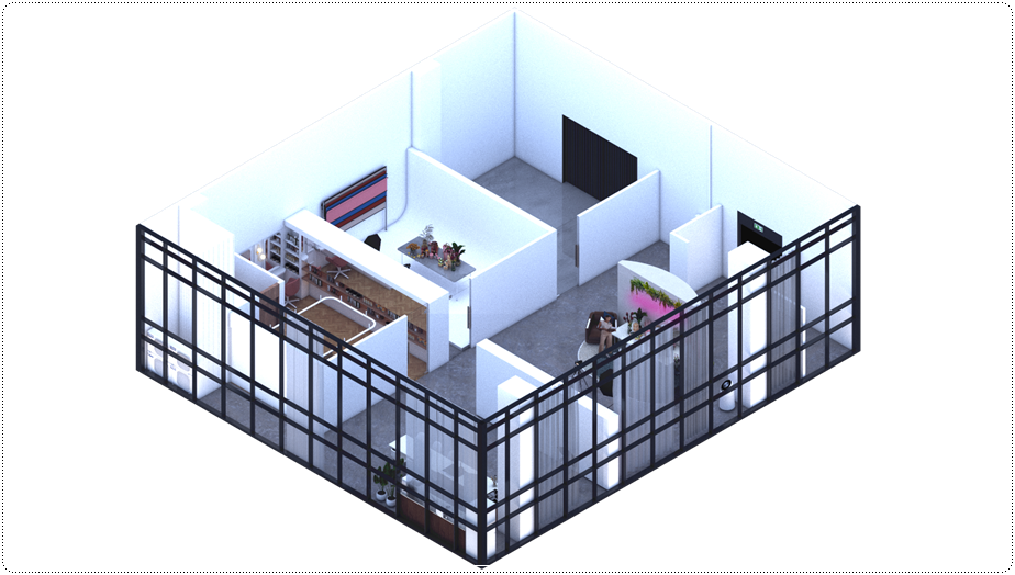 평면 설계와 함께 3D 이미지, 아이소매트릭을 함께 작업했던 프로젝트여서 이도 함께 보여드리려고 합니다. 정사각형에 가까운 사무실에 촬영 스튜디오와 뷰티사업을 함께 진행할 수 있도록 공간을 구성해드렸습니다. 촬영 스튜디오, 메이크업, 피부 마사지, 개인방송실, 사무실, 회의실, 휴게실 등을 함께 구성하기에는 좁은 면적이었기에 복층을 제안드렸고 단층, 복층 하부, 복층 상부로 나눠 각각의 영역성을 부여해 다양한 퍼포먼스가 이뤄지도록 계획했습니다.