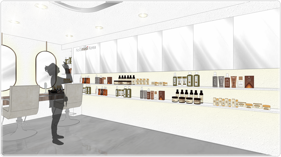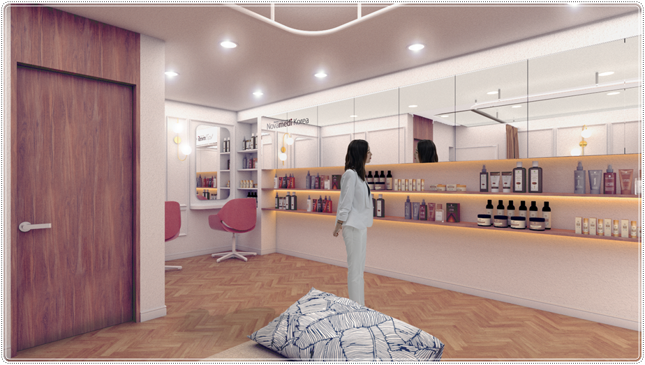 복층 하부에 배치된 시연실입니다. 뷰티 관련 마사지, 메이크업 등을 진행하는 곳으로 전체적으로 깔끔하고 화사해 보이기 위해 화이트로 계획하고 밝은 조명을 적용해 충분한 조도를 확보하도록 했습니다. 시연 후 개인방송을 할 수 있는 스튜디오를 연결해 밖으로 나오지 않고 바로 진출입할 수 있도록 계획하면 편리하게 이용할 수 있는데요, 이 때 방음을 위한 방음재 계획도 함께 진행해야 합니다.