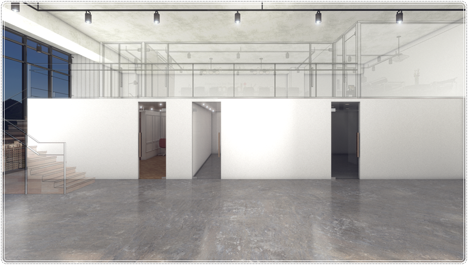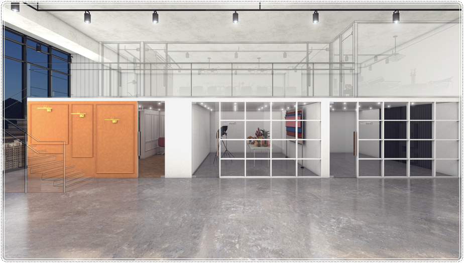 복층 구조물로 계획된 공간 디자인입니다. 하층부에는 합판 가벽을 계획하면 프라이버시를 완벽하게 보장할 수 있고 유리 가벽을 계획하면 공개방송같은 오픈 스튜디오로 활용할 수 있으며 개방성을 확보할 수 있습니다. 이는 업종의 특성과 공간의 사용목적에 맞게 디자인해야하는데요, 916디자인에 문의해주시면 상담부터 시공까지 전문가의 도움을 받으실 수 있습니다.
