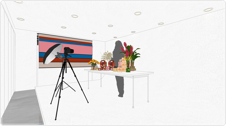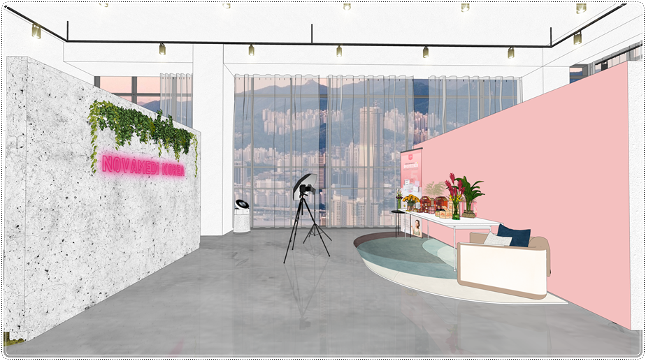 촬영 스튜디오입니다. 라이브방송, 콘텐츠 촬영, 화보, 홍보영상 등을 촬영할 수 있는 조명과 배경을 계획해 다양하게 활용할 수 있도록 했는데요, 천장에 레일 조명을 적용하면 위치와 각도에 따라 조절할 수 있어 실용적으로 사용할 수 있답니다.