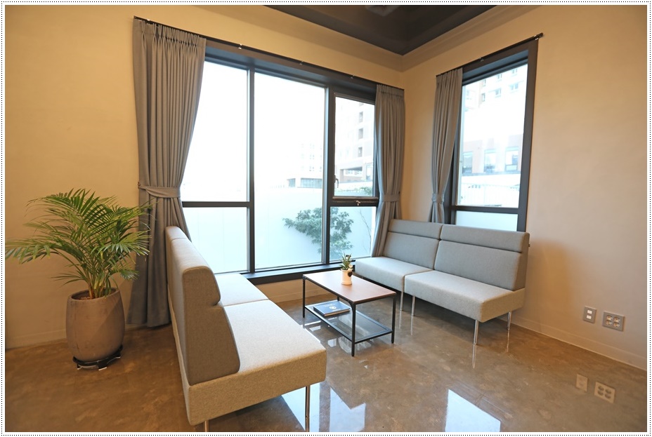 손님을 응대하는 응접실 공간입니다. 창문으로 테이블과 의자를 배치해 쾌적한 환경이 되도록 했는데요, 창문에 커튼을 시공해 때에 따라 해와 열기를 막을 수 있도록 했습니다. 테이블은 상판이 작고 프레임으로 구성된 가구를 배치하고 의자 또한 다리가 있어 아래를 띄워 답답하지 않게 함으로써 공간에 여유를 줘 더 넓어 보이는 효과를 주었답니다.