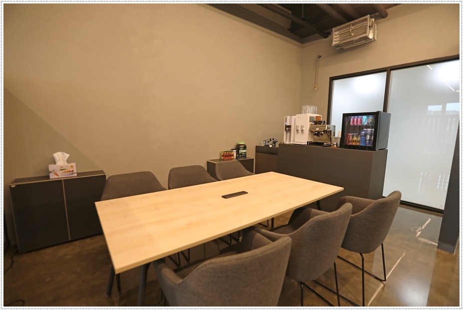 회의실 겸 휴게실입니다. 회의실과 탕비실을 어떻게 구성해야하다가 최근 트렌드인 카페같은 사무실인테리어에서 착안해 자유로운 분위기에서 회의할 수 있는 공간을 만들어 두 가지 요건을 충족했습니다. 전체적으로 그레이톤으로 마감을 해 너무 차분해질 수 있는 공간에 연한 우드톤의 상판 테이블을 배치해 가벼운 무드를 연출하면서 아늑하고 편안하게 사용할 수 있도록 했습니다.