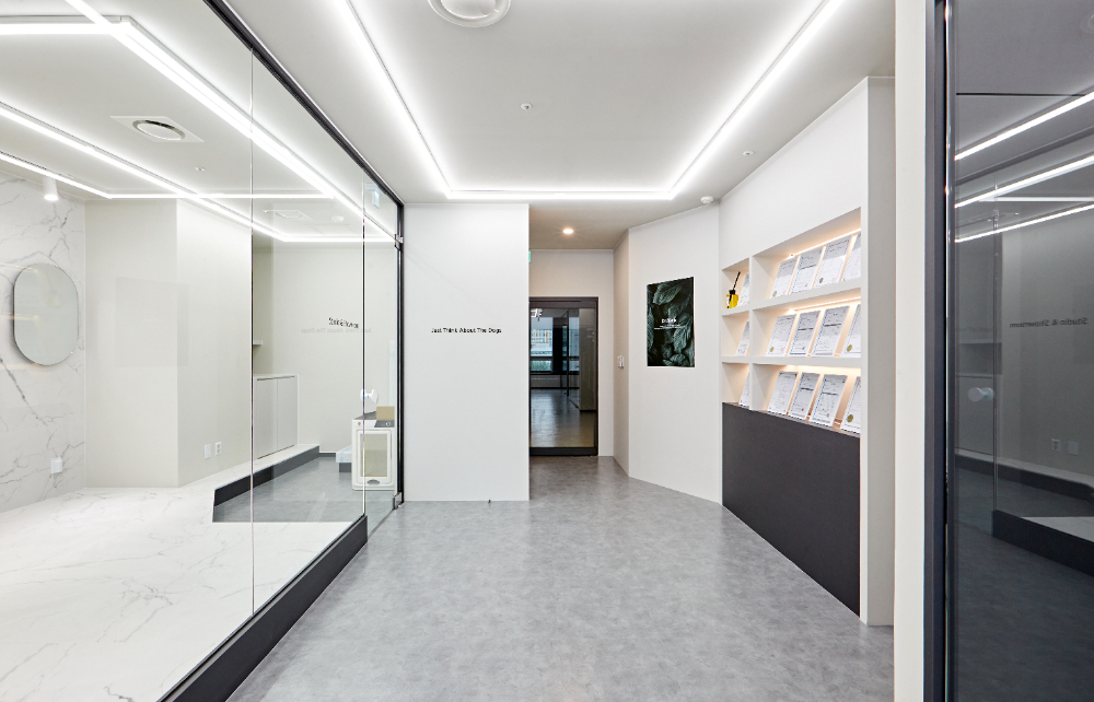 쇼룸의 내부로 들어서면 그 환한 느낌을 더욱 선명하게 받아보실 수 있는데요. 내부에 들어서있는 기구에 비해서 공간이 너무 넓게 쓰여진 것아니냐고 느낄 수 있지만, 이곳에서 제품 촬영이 이뤄지기도 하고 실제로 강아지가 들어와서 편안한 환경에서 머물러야 하기에 이렇게 마련된 부분을 고려해주시기를 바랍니다.