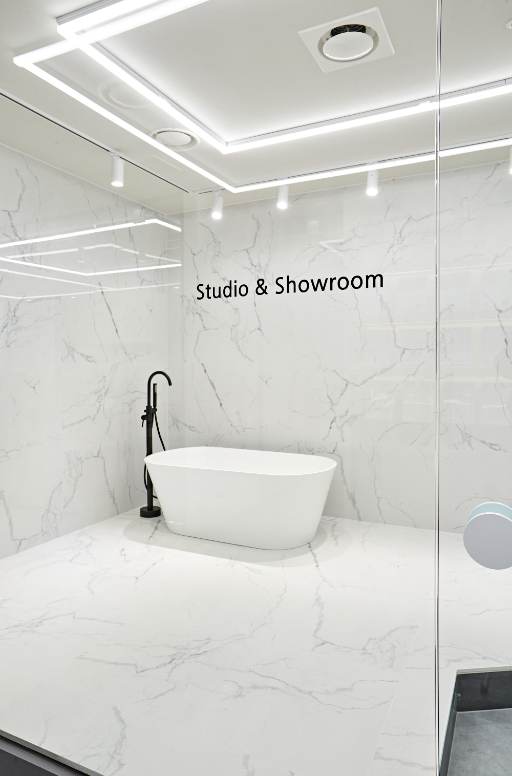 블랙 프레임으로 전체를 마감하고 내부에는 실제로 이곳에서 판매되는 샴푸와, 바스용품, 미스트 등을 써볼 수 있는 곳으로 실용성 높게 꾸며졌습니다. 조명은 라인 사각조명이 천장에 매립되어 있으면서도 레일 조명도 함께 배치되었는데요. 보통 쇼룸은 이목을 집중시켜야 하기에 이렇게 많은 조명으로 시야를 밝히는 것이 대부분입니다.