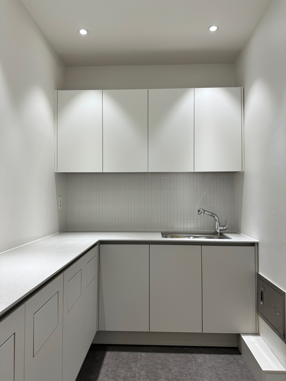 공간은 화이트 수납장과 모자이크 타일로