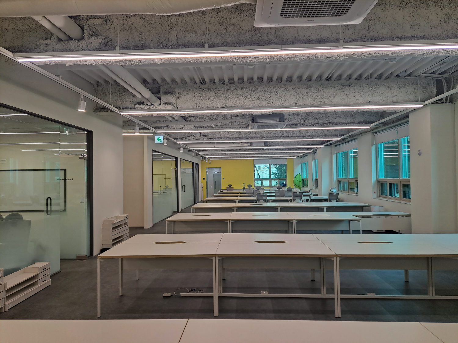 노출형 천장에는 LED 바 조명을 설치하였고 벽 2면의 창을 모두 살려 전체적으로 밝고 개방감 있는 모습입니다.