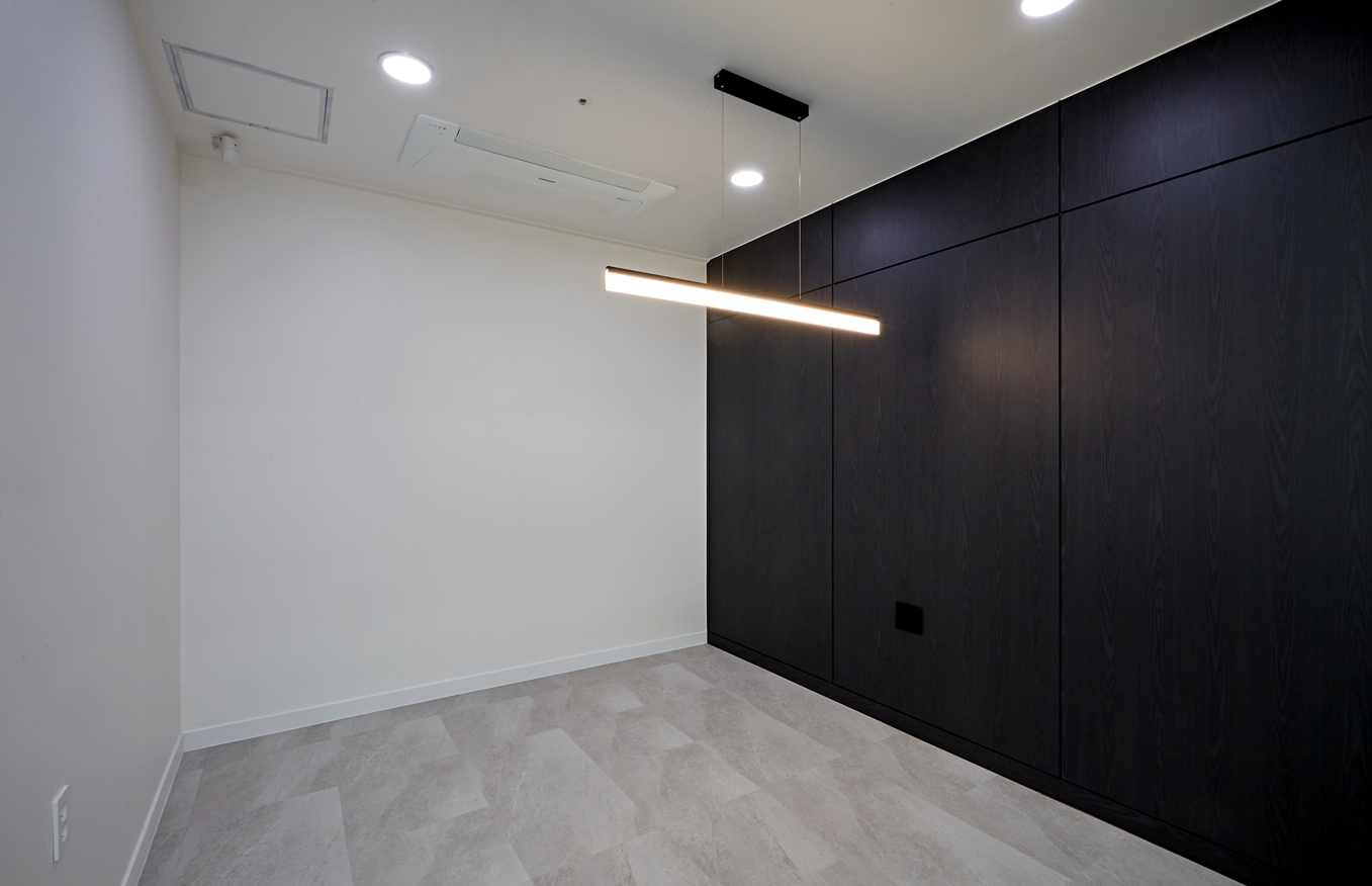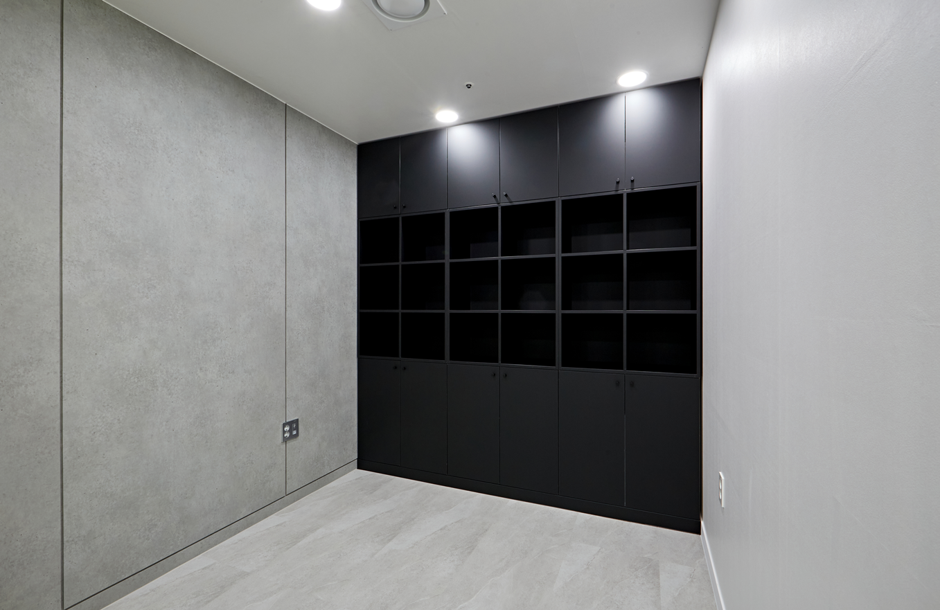 또한 벽면에는 붙박이 수납장을 설치하여 필요한 서류나 책들을 쉽게 정리할 수 있도록 하였습니다.