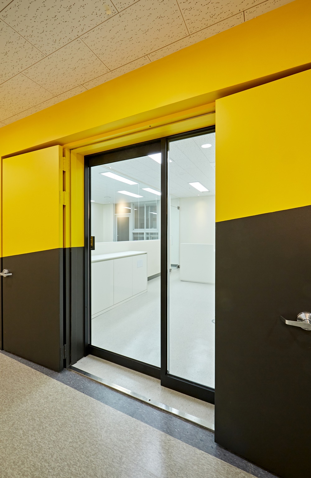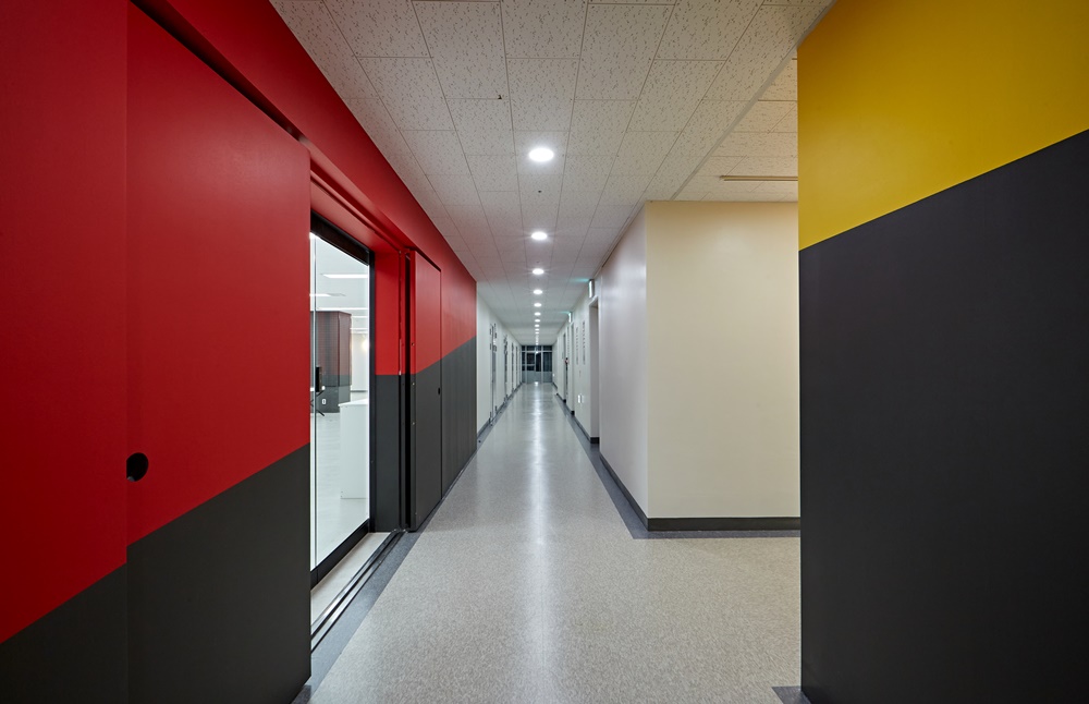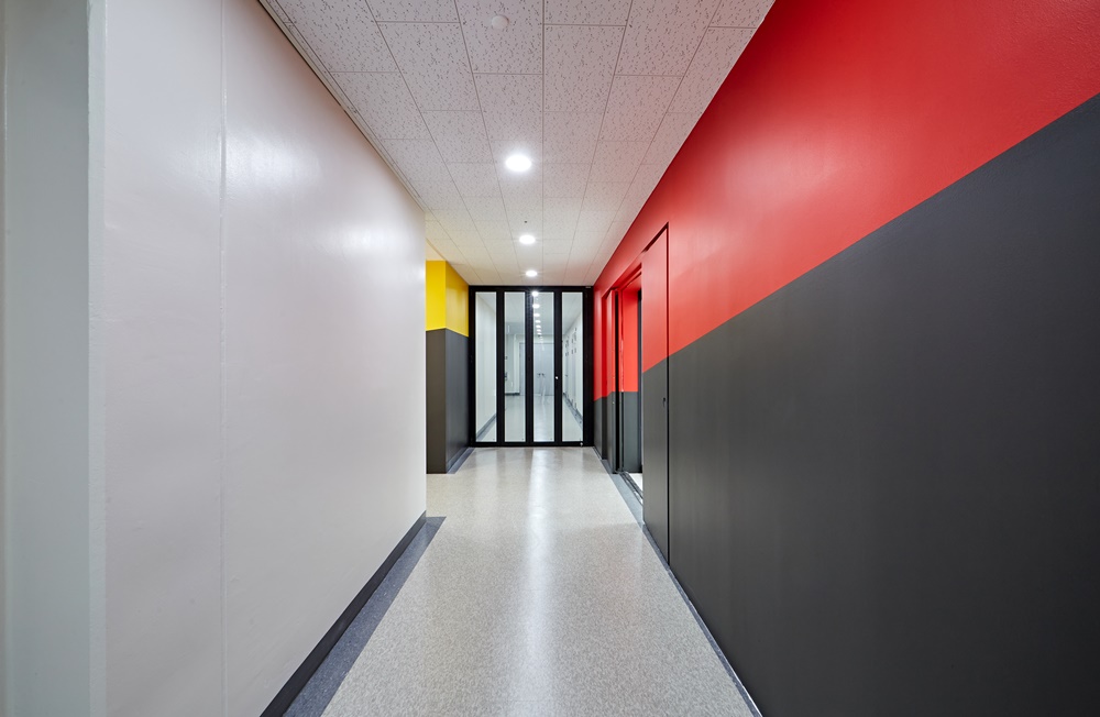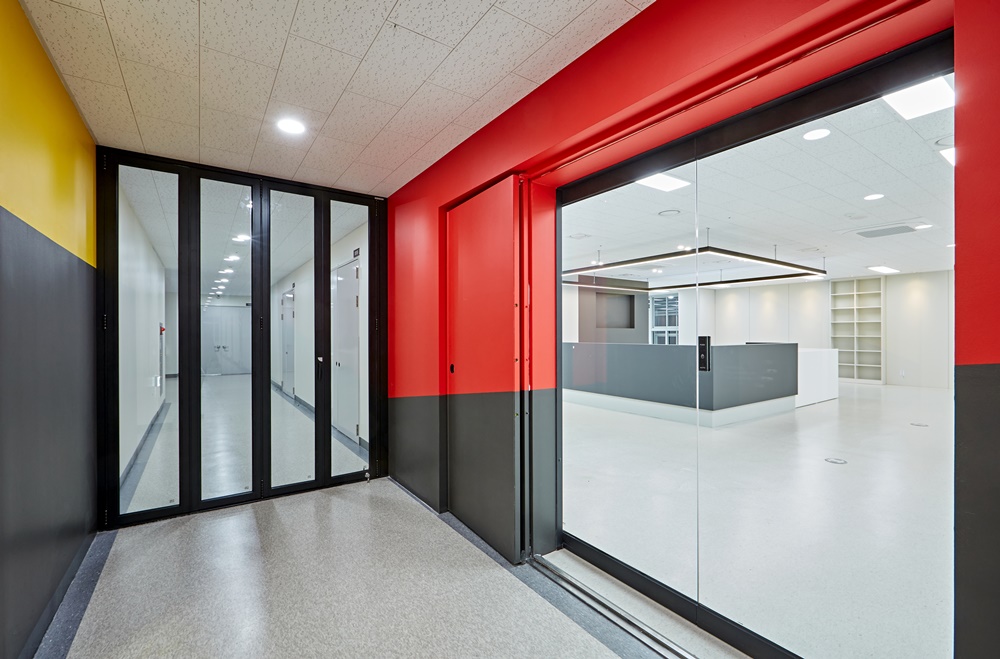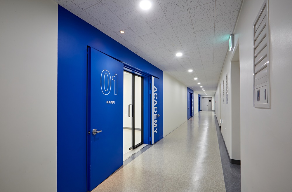 외부 파사드 벽면에는 빨간색과 노란색을 선택해 시선을 집중시키고 주변의 시설들과도 조화롭게 어우러지도록 했죠.