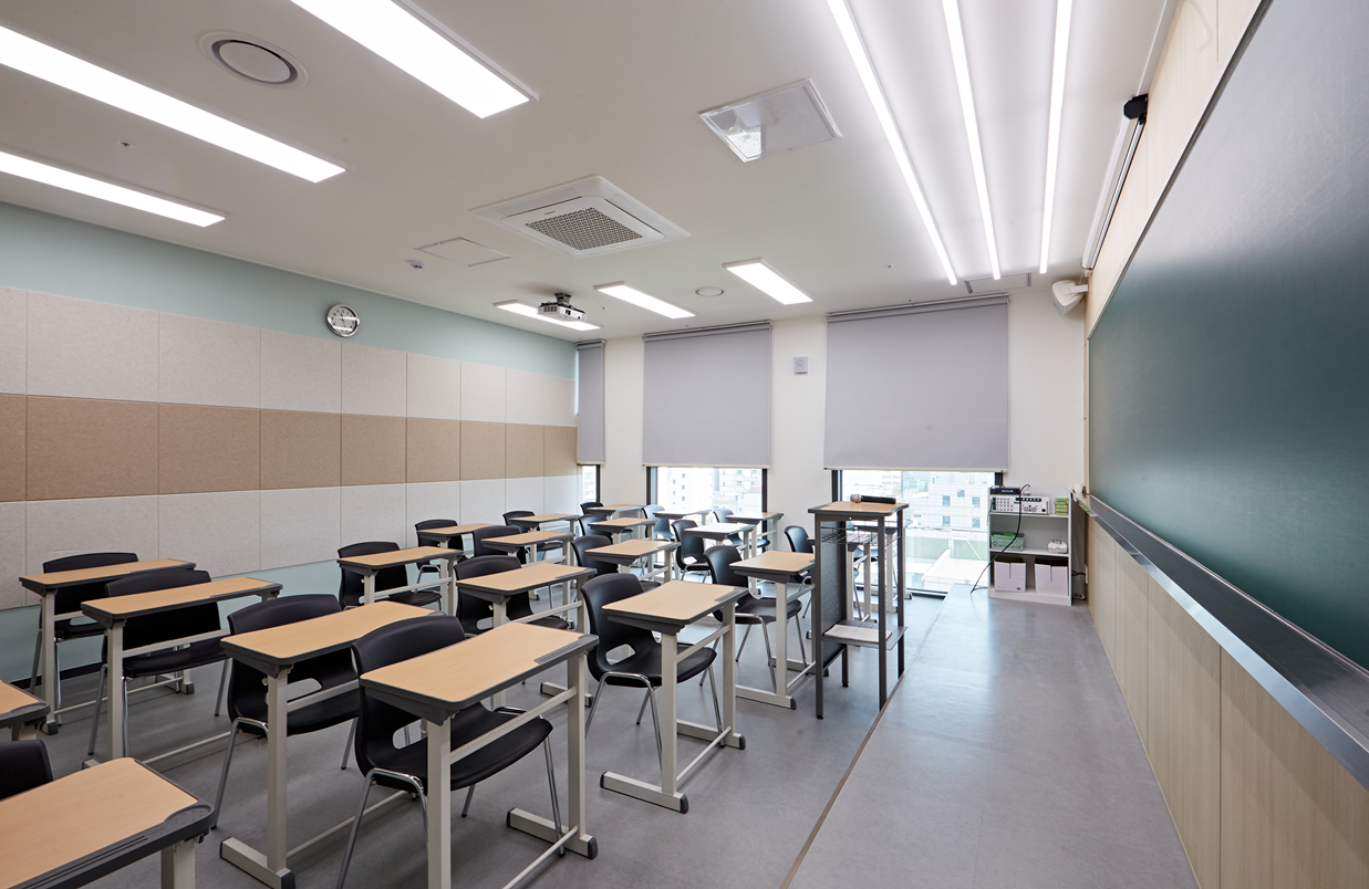 몰입도를 높였습니다. 강의실 전면에는 광폭 초록 칠판을 설치하고 양옆 벽면에는 흡읍 패널을 부착해