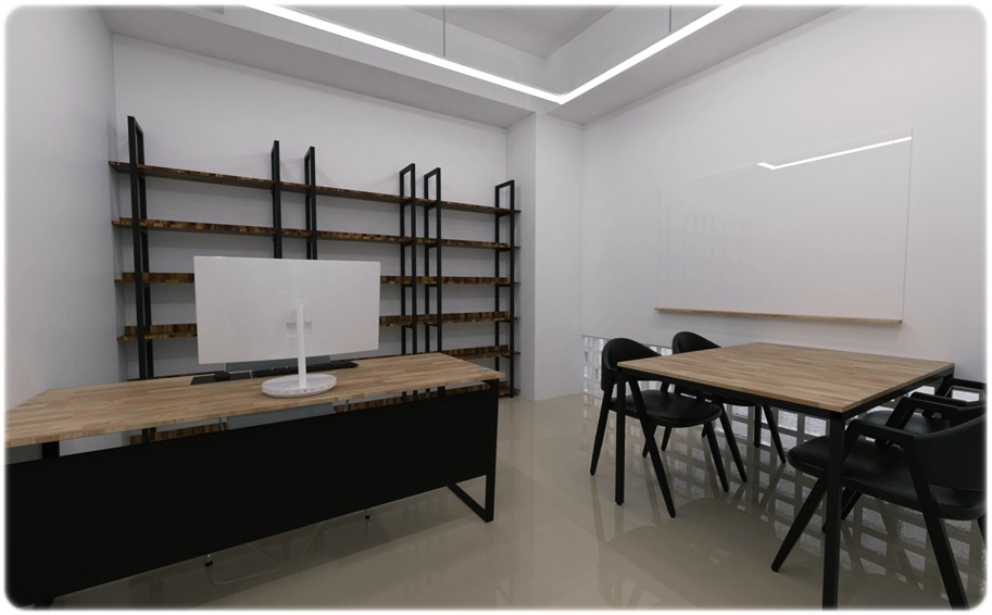 자율학습실로 활용할 수 있는 공간입니다. 화이트, 진그레이를 적용해 깔끔하고 세련된 공간으로 디자인했고 바닥은 베이지 계열의 빈티지 노출로 마감하면 천장 조명이 반사되어 더욱 밝고 화사한 공간이 될 수 있습니다. 천장 조명을 라인 조명을 적당한 간격으로 시공해 벽면에까지 충분한 조도가 확보될 수 있도록 했고 파벽돌을 적용한 포인트 벽면을 계획해 공간적 통일성을 주었습니다.