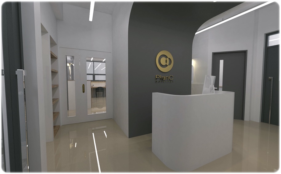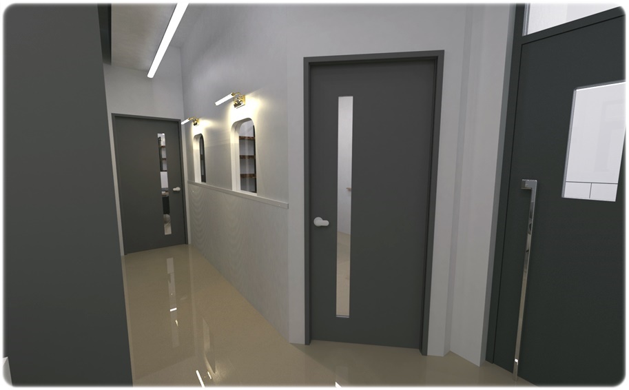 로비 공간 3D입니다. 벽면과 천장은 화이트를 적용하고 아치형 면은 진그레이와 골드 사인물을 계획해 포인트가 되면서 밸런스를 이루도록 했으며 아치형 벽면의 진그레이는 내부 공간별 도어에도 적용해 인테리어의 통일성을 부여했습니다. 인포데스크 테이블은 곡선형을 적용해 아치형 벽면과 조화되도록 했고 벽면에 선반형 수납장을 두어 다양한 수납이 이뤄지도록 했습니다.