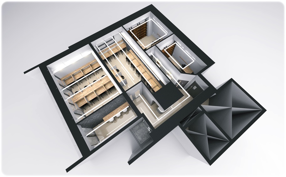 화이트 인테리어를 적용하되 빈티지한 파벽돌로 한쪽 벽면을 마감하면 포인트가 되면서 잠시 긴장을 풀 수 있는 요소가 될 수 있습니다. 앉아서 간단한 식음료를 섭취할 수 있는 테이블을 포인트 벽면으로 배치해 독립적으로 사용할 수 있도록 했고 다른 벽면에는 무지주 선반을 달아 수납 혹은 진열을 위한 목적으로 사용할 수 있도록 했습니다.