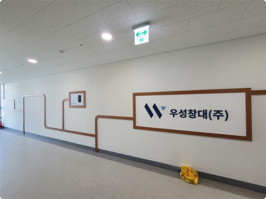 입구가 있는 벽면은 우드 알판을 시공하고 화이트 라인을 구현해 심플하면서 감각적인 디자인을 구현했습니다. 회사로 진입하는 복도 초입-회사명 사인물-입구로 이어지는 라인으로 동선을 유도하면서 호기심을 자극했답니다.
