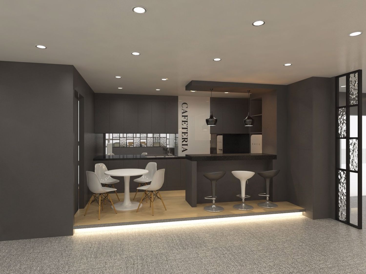휴게공간의 맞은편에는 탕비실 공간이 마련되어있는데요. 아일랜드 식탁의 아래에는 깔끔하게 분리수거가 가능하도록 디자인 되어 있으며 냉장고장과 상하부장으로 수납 공간을 충분히 마련하였습니다. 직원분들이 업무시간 중 출출하실 때 간단한 다과를 드시거나 편하게 조리하실 수 있어요.